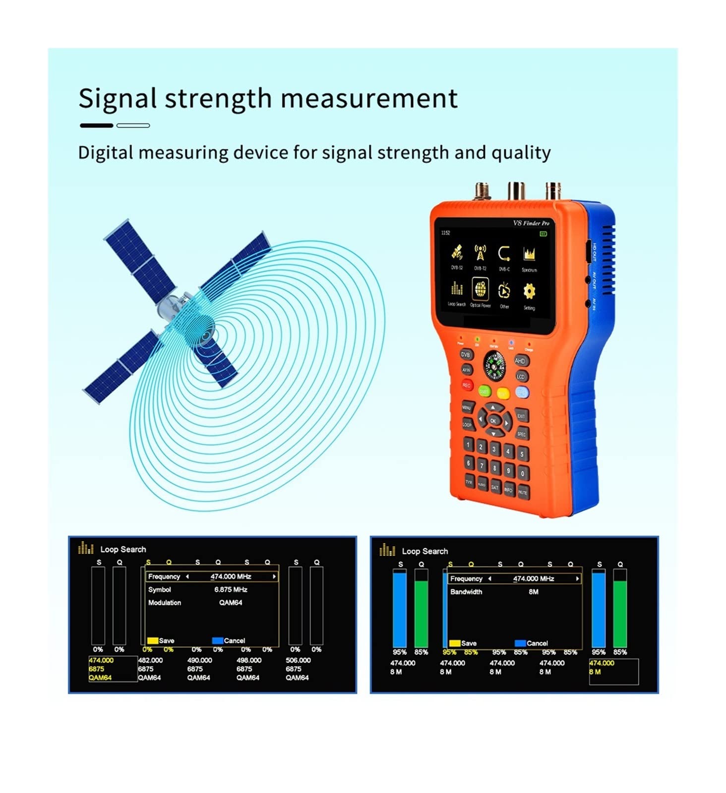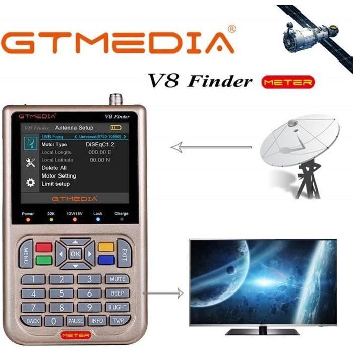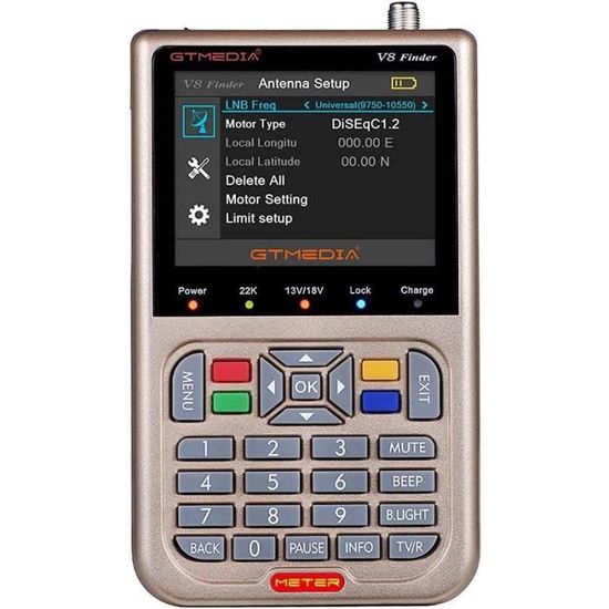 Appareil de mesure numérique pour la force et la qualité du signal. Mètre Force Qualité Signal HD H.265 Détecteur De Satellite KPT-968G Satellite Finder TFT LED DVB-S2 DVB-S Signal 3.5 Pouces TFT LED Analyseur Signal Satellite Numérique WS-6906 Détecteur de signal satellite numérique professionnel avec TV Fonctionnalité:Prise en charge de la recherche en boucleAnalyseur de constellationsAnalyseur de spectrePrend en charge le balayage automatique, aveugle, manuel ou NITSon pour le signal de verrouillageCalculer automatiquement l'angle de AZ, ELHaut-parleur intégréPrend en charge à la fois la sortie AV et l'entrée AVPrend en charge les deux sorties Prise en charge de la fonction boussolePrise en charge de l'affichage de la puissance en temps réel, avec rappel de faible puissanceProtection courte LNBBatterie Li-ion 7., 4V/4000mAh incluseMise à jour du logiciel via le port USBFacile à porterEmballage inclus:- 1x V8 Finder Pro- 1x câble AV- 1x adaptateur secteur- 2x Pièces REC- 1x sac de protection (facultatif)- 1x manuel d'utilisation Metronic 450003 Pointeur / Mesureur de signal satellite à aiguille... Prend en charge DISEQC 1., 0/1., 1/1., 2, Unicable, tonalité 0/22 kHz Entièrement compatible DVB-S2X/S2/S/T2/T/C/ATSC-C, MPEG-2/MPEG-4