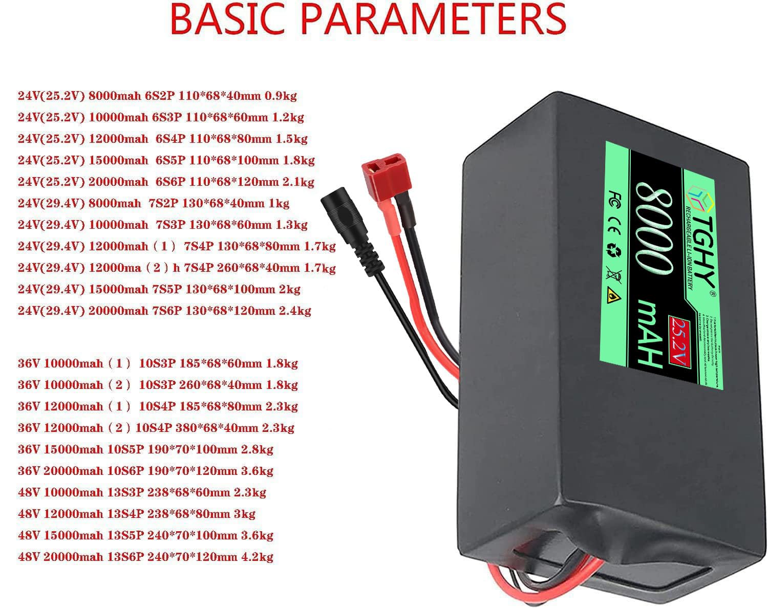 Baterías Recargables de Iones de Litio LiFePO4 Batería de Ion de Litio Spécifications de la batterie au lithiumTension nominale : 25,2 V 29,4 VCapacité nominale : 8 AH / 10 AH / 12 AH / 15 AH / 20 AHRéglage du moteur : moteur 0 - 500 WCourant : 1 - 200 ACoque : PVCTaille de la batterie :24 V (25,2 V) 8 000 mAh 6S2P 110 x 68 x 40 mm 0,9 kg24 V (25,2 V) 10 000 mAh 6S3P 110 x 68 x 60 mm 1,2 kg24 V (25,2 V) 12 000 mAh 6S4P 110 x 68 x 80 mm 1,5 kg24 V (25,2 V) 15 000 mAh 6S5P 110*68*100mm 1., 8kg24V(25., 2V) 20000mah 6S6P 110*68*120mm 2., 1kg24V(29., 4V) 8000mah 7S2P 130*68*40mm 1kg24V(29., 4V) 10000mah 7S3P 130*68*60mm 1., 3kg24V(29., 4V) 12000mah(1) 7S4P 130*68*80mm 1., 7kg24V(29., 4V) 12000mah(2)7S4P 260*68*40mm 1., 7kg24V(29., 4V) 15000mah 7S5P 130*68*100mm 2kg24V(29., 4V) 20000mah 7S6P 130*68*120mm 2., 4kgListe de colisage incluse :1 x batterie au lithium1 x chargeur secteur Batterie Li-ion étanche PVC TGHY Batterie Li-ion 24v 8ah 10ah 12ah 15ah 20ah Batterie De Batterie étanche PVC Charge Rapide Si notre produit présente un problème, veuillez nous contacter. Cette batterie lithium-ion est composée de cellules de haute qualité et intègre un système de gestion de batterie (BMS) ainsi qu'une protection contre la surcharge, les surtensions et les courts-circuits La batterie Li-ion est de 24 V 8 Ah 10 Ah 12 Ah 15 Ah 20 Ah/29,4 V 8 Ah 12 Ah 20 Ah. Batterie au lithium de 25,2 V, compatible avec un moteur de 50 W à 500 W. La couche extérieure de la batterie est en PVC imperméable, isolante et résistante à l'usure. Cette batterie lithium-ion est composée de cellules de haute... La couche intérieure présente les avantages d'un point de fusion bas, d'un joint étanche et d'une adhérence élevée. Batterie au lithium de 25,2 V, compatible avec un moteur de 50 W à 500 W. Notre pack de batterie est doté d'une charge rapide, d'un effet mémoire, d'une étanchéité et d'une résistance à l'humidité, d'une protection environnementale verte, d'une faible autodécharge, d'une résistance à l'usure, d'une longue durée de vie et d'une large gamme d'applications. Les batteries au lithium ont un rapport poids-énergie et un rapport volume-énergie plus élevés et peuvent être stockées pendant une longue période. La couche extérieure de la batterie est en PVC imperméable, isolante et résistante à l'usure. Le BMS surveille la batterie en mesurant la tension, la température, le courant et l'état de charge, ce qui peut empêcher la surtension de la batterie, la surintensité, la surcharge, la protection contre les courts-circuits et protéger la batterie et sa durée de vie prolongée.