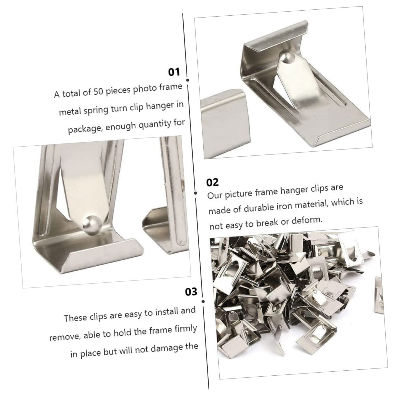 Atyhao Clip de crochets de marcheur Clips de Crochet de Marcheur Clips... Idéal également comme clips serrés et de maintien pour le lit de l'imprimante 3D. Taille (L xl):Type A : 25 x 12 mm/1 x 0,48 pouceType B : 26 x 11 mm/1,04 x 0,44 pouce Accessoires Cadre Photo Peinture Miroir THua Store 50Pc Cadre Photo Clips Attaches Crochets Cadre Photo En Métal Printemps Tourner Clip Cintre Peinture Miroir Cintre Art Travail Photo Mur Crochet (Color : Silver-01 Attaches Cadres Photo Métal Fabriqué en bon matériau métallique de couleur argentée, une attache importante pour accrocher des cadres en bois ou des toiles. Crochets Cadre Robuste D Anneaux Cadre Picture Hangers avec Vis pour... État : tout neufMatériel: MétalCaractéristiques:50 pcs ton argent photo cadre photo en métal ressort tour clip cintre. Cadre Photo en Métal Elisa 20x25cm Or