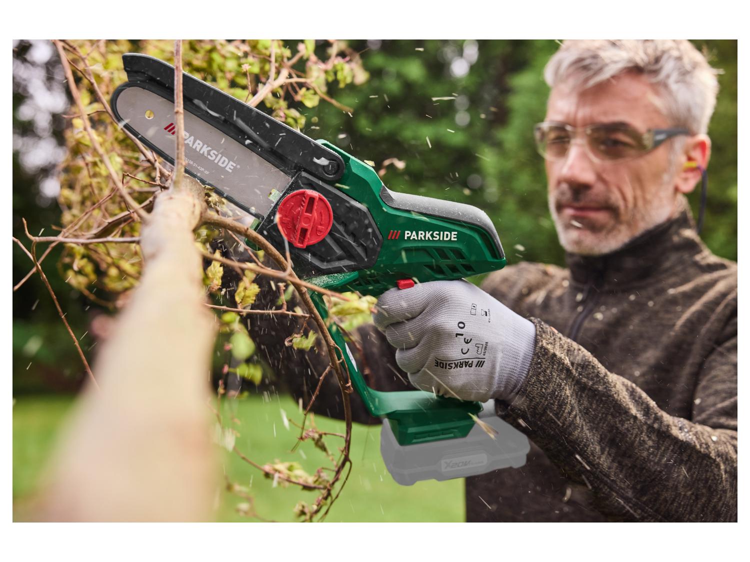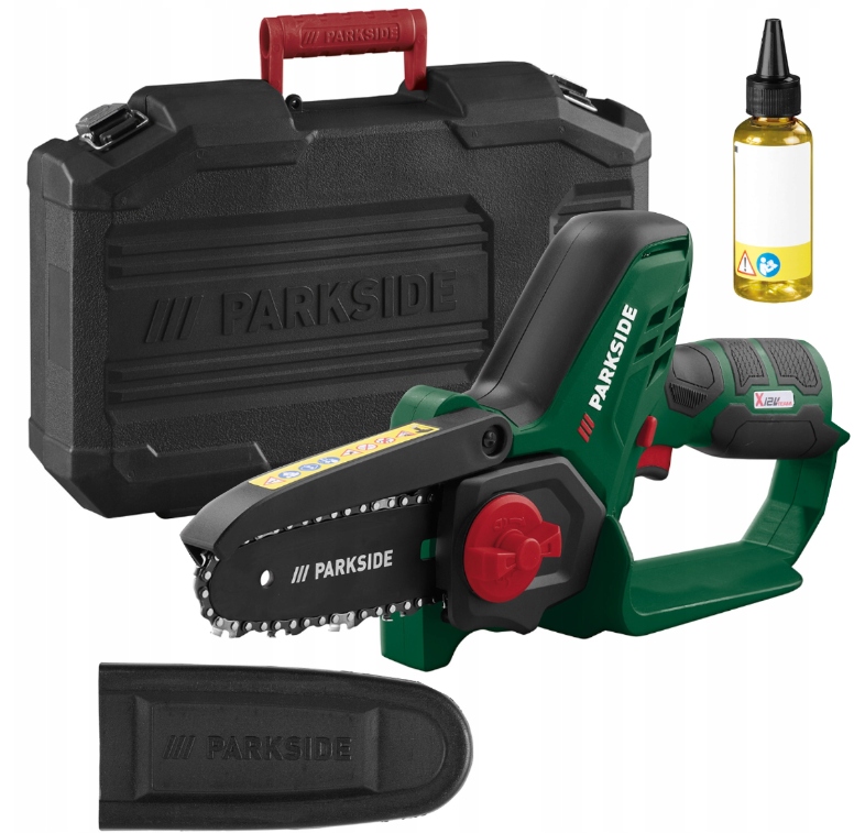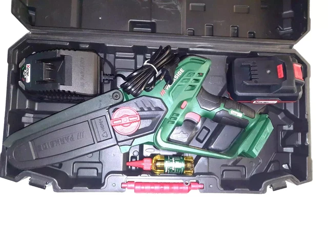 Chaîne Silence Changement Rapide PARKSIDE® MINI-TRONÇONNEUSE À Bois Sans Fil PGHSA 20-Li B1, 20 V EUR 69 Mini Tronçonneuse Sans Fil Marque : Parkside · Pour couper des arbres et des arbustes et pour hacher des coupes vertes, idéal également pour couper des planches, des bois équarris et ronds... Guide d'utilisation de la scie d'élagage sans fil PARKSIDE PGHSA 20-LI B1 20 V Vitesse de la chaîne : 5,6 m/s, fonction de changement rapide de chaîne sans outil, tension automatique de la chaîne , Matériau : plastique PARKSIDE® TRONÇONNEUSE SANS fil PGHSA 20V VENDUE AVEC BATTERIE 20V 2A... Dimensions : environ 37 x 7,5 x 17 cm , Poids : environ 1,26 kilogrammes Particulièrement compact avec un faible poids propre - Pour scier confortablement avec un travail rapide Livré sans batterie ni chargeur, compatible avec tous les appareils de la série Parkside X 12 V Team, batterie recommandée : 12 V (4 Ah) Image du produit Parkside® PGHSA 12 C3 Mini tronçonneuse sans fil 12 V sans batterie ni chargeur, Marque : Parkside