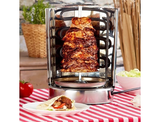 Pour de délicieux kebabs grillés sous vos yeux Grill Vertical pour viande de Kebab et Brochettes : Kebab maison... Minuteur pour une préparation à la minute près Encore plus performant et capacitif, le grill à kebab avec vitre vous permettra même de cuire du poisson ou d'avantage de brochettes ! Rosenstein & Söhne 2000w Cuisson Tournante Barbecue électrique De Table 1650 W ROSENSTEIN & SOHNE Rosenstein & Söhne Grill Barquette pour la cuisson des légumes, fruits de mer, etc. Viande spécial kebab, ou volaille entière : choisissez vous-même la pièce de viande, les épices et accompagnements, pour régaler famille et amis avec une viande grillée et juteuse. Broche centrale avec pics pour y fixer une pièce de viande : kebab ou volaille Dimensions : 280 x 455 x 335 mm, capacité 21 L Inclus : 1 grille de protection, 1 broche centrale avec 2 pics, 1 barquette de cuisson Le minuteur vous assure une cuisson toujours réussie. Appareil ouvert, pour se servir directement sur la broche Les points forts : Pour kebab, brochettes et poulet grillé; Cuisson régulière et homogène; Les graisses s'écoulent pour une cuisson plus saine Profitez d'un grill d'une puissance de 2000 W pour griller à merveille votre viande et obtenir un croustillant succulent. Les graisses s'écoulent pour une cuisson plus saine oneConcept Kebap Master - Rôtissoire verticale, Machine à kebab, Grill