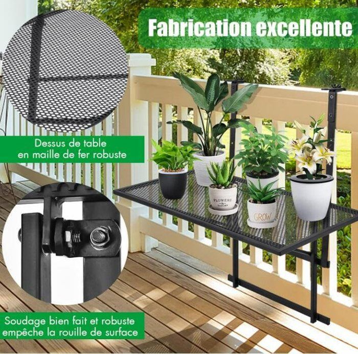 Table Terrasse Espace Réduit Outsunny Table De Balcon Suspendue Pliable Plateau Rectangulaire Et Table Plateau Maille Noir Table De Balcon Suspendue 40 X 60 Cm Table De Balcon Rabattable Gris M Tal Hauteur R Glable Les Tables de balcon sont idéales si vous souhaitez profiter au maximum de l'espace de votre balcon. Vous pouvez facilement le monter sur votre balcon afin... Cette table sert de table de bar, de support pour plantes suspendues et de poste de travail en plein air. Bras de Suspension Réglables - Dotée de bras de suspension réglables, cette table de balcon s'adaptent facilement aux balustrades d'une épaisseur allant jusqu'à 6 cm, ce qui la rend adaptée à différents types et largeurs de balustrades. Le clip de fixation et les supports triangulaires assurent une base solide, vous permettant de placer une variété d'objets sur la table. Économisez de l'espace grâce à son design pliable, idéal pour les balcons ou terrasses de petite taille. Design Pliable et Peu Encombrant - Caractérisée par un design peu encombrant, il suffit de replier la table lorsque vous ne l'utilisez pas pour économiser de l'espace, idéal pour les petits balcons, les patios ou tout espace extérieur où l'espace est limité. Que ce soit pour prendre le petit déjeuner, exposer des plantes ou travailler en plein air, cette table pliante est parfaite pour vos besoins. Vous pouvez facilement installer la table suspendue sur des balustrades carrées/rondes ou en bois/métal, ce qui en fait un choix pratique pour profiter de plein air. Table De Balcon Suspendue Pliable Avec Hauteur 73/78,5/84cm, Table...