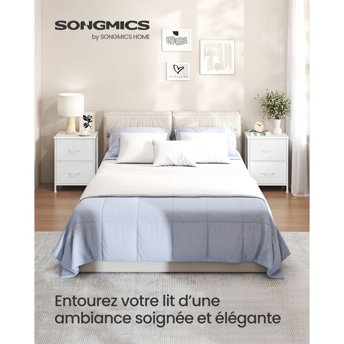 Capacité de charge statique maximale du dessus : 30 kg Fixe le meuble au mur pour plus de sécurité et de sérénité. Assurent la stabilité du meuble, même sur un sol légèrement irrégulier. Caractéristiques : Couleurs : Blanc nuage, blanc neige Les atouts de ce meuble de rangement en bref : Polyvalente : Cette petite table basse s’adapte à tous les styles et trouve sa place aussi bien dans une chambre que dans un dressing, un couloir ou le salon. Nos acheteurs adorent 24,99 € chez ManoMano Voir l'offre Comparez 2 offres à partir de 21,99 € Filtres Livraison gratuite Prix croissant Pertinence Prix croissant Prix décroissant Prix total croissant Prix total décroissant Table de Chevet - SONGMICS - 2 Tiroirs - Blanc Nuage et Blanc Neige - Acier et MDF Blanc Produit neuf ★ 4.6 / 5 Plus d'informations 21,99 € Livraison gratuite... Le plateau supporte jusqu’à 30 kg, chaque tiroir jusqu’à 5 kg Montage facile : Le montage est facile grâce aux instructions claires, aux pièces numérotées et à l’outil fourni. Facilitent l’ouverture et la fermeture des tiroirs. Table De Chevet Avec Tiroirs Table De Chevet - Naturel - 2 Tiroirs - MDF Peint - Bois De Pin - Rotin Table D'appoint MDF Acier SONGMICS Table de Chevet avec 2 Tiroirs en Tissu Non-tissé, Acier, MDF, pour Chambre, Table d'Appoint, Marron Rustique et Noir d'Encre LGS312BH04 ... Livraison... Robuste : Conçue avec un cadre en acier, un plateau en panneaux d’aggloméré et des tiroirs en tissu non-tissé renforcés par du MDF, ce meuble est solide. Si c’est le cas, veuillez aérer le produit dans un endroit bien ventilé. Capacité de charge statique maximale de chaque tiroir : 5 kg, Livraison : 1 x Commode, 1 x Kit de montage , 1 x Dispositif anti-basculement, 1 x Mode d’emploi Un kit anti-basculement est fourni pour une sécurité renforcée Buffet bas Style Industriel en Bois et Acier Bois foncé Maidenhead Pour des raisons de sécurité, veuillez fixer le meuble au mur à l'aide du kit anti-basculement fourni. Structure solide : Fabriquée avec un cadre en acier, un plateau en panneaux d’aggloméré et des tiroirs en tissu non-tissé renforcés de MDF, elle est conçue pour durer. Stable et sécurisée : Les pieds réglables assurent une bonne stabilité et un kit anti-basculement est fourni pour une utilisation en toute sécurité. Rangement : Ses tiroirs fermés offrent beaucoup d’espace pour ranger vos affaires, le plateau du dessus accueille lampe, réveil ou objets favoris.