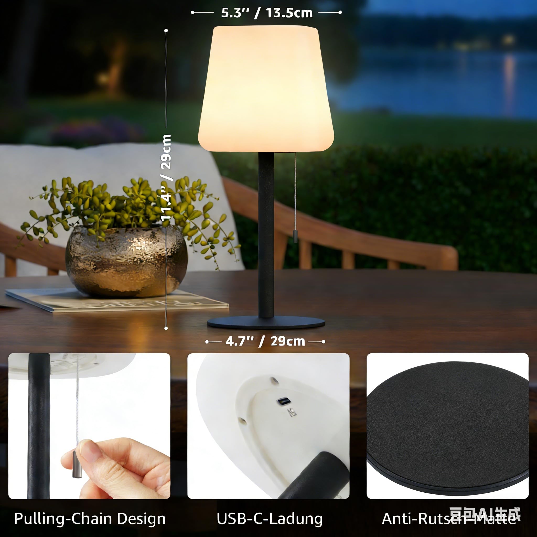 Charge USB universelle et portabilité : charge en 4,5 heures via n'importe quel port USB (compatible avec ordinateur portable/banque d'alimentation). Lampe De Chevet Sans Fil Lampe De Table Lampe Solaire Lampe D'extérieur Lampe De Terrasse Lampe De Table Pour Balcon Lampe Table Rechargeable Lampe de table LED sans fil - Étanche IP44 - Portable - Intensité variable - 3 températures de couleur - Pour l'intérieur et l'extérieur - Avec USB-C Éclairage efficace, économique et respectueux de l’environnement. Dernières pièces disponibles à prix exceptionnels ! Technologie, qualité et design - la marque Lucande. Transformez votre intérieur grâce à une lumière chaleureuse ! Lampes & s pour votre deuxième salon. Besoin d'un conseil ? Notre service client est à votre disposition IP44 résistant à la pluie pour une utilisation en extérieur : construit avec des joints d'étanchéité IP44 pour résister aux conditions sur les terrasses, les balcons ou dans le jardin. Ne vous inquiétez plus de la pluie soudaine ou des déversements - cette lampe de table d'extérieur résiste aux conditions météorologiques imprévues MALUX Lampe de table LED sans fil à intensité variable - 8 couleurs changeantes - Lampe d'extérieur étanche IP44 - Pour la maison, le jardin, l'hôtel... Ainsi, vous pouvez créer l'ambiance dans les chambres à coucher, les bureaux à domicile ou lors d'événements romantiques avec cette lampe de table LED 3 couleurs d'éclairage et gradation réglables : passez facilement entre les modes LED blanc chaud et blanc froid avec une seule touche. Base amovible pour un placement flexible : la base amovible unique permet de convertir instantanément une lampe de table stable à un spot portable. Postlucky Lampe de Table Solaire Exterieur LED Sans Fil 3 Couleur Maintenez enfoncé pour réduire la luminosité de 10 % à 99 %. Fixez-la sur des étagères, fixez-la aux tentes ou portez-la dans les coins sombres.