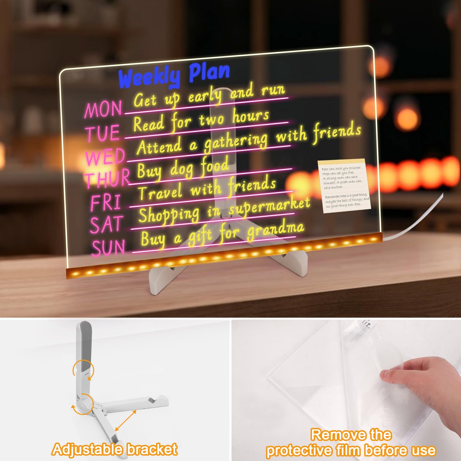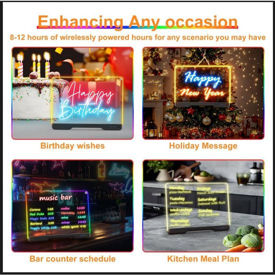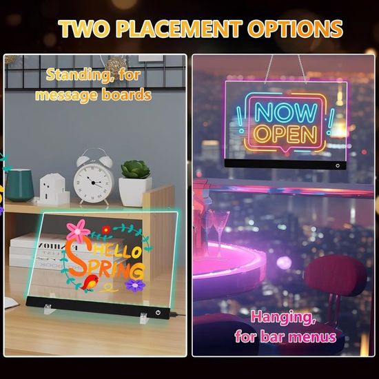 Vous pouvez écrire rapidement sur le tablette dessin lumineuse LED et les marqueurs à séchage rapide 7 couleurs inclus permettent une écriture fluide sans vous salir les mains. Dès que vous le branchez, l'écran s'anime et chaque trait de couleur est vibrant, fluide et éclatant. 👏【Scénarios D'application】Simplifiez vos pensées, vos messages, vos tâches de gestion et illuminez n'importe quel espace avec une touche agréable. 🔄【Tableau Lumineux LED Effaçable】Le tableau à dessin LED est fabriqué en acrylique de qualité alimentaire, très durable et robuste. Tables lumineuses - Mes Petits Dessins Essuyez-le simplement une fois avec un chiffon humide ou une serviette en papier humide, puis essuyez-le avec un chiffon de nettoyage sec. Il peut être utilisé comme tableau de calendrier pour entourer les dates importantes ; il peut être utilisé dans toute occasion où des informations importantes doivent être affichées. Tableau Lumineuse Message LED, Tableaus en Acrylique avec 7 Couleurs Stylo, Avec Support Réglable, D'écriture LED Lumineux Transparent, Essuyable, Tableau D... Nos tableaux blancs acryliques à LED constituent des cadeaux attentionnés pour les anniversaires, Noël, la Saint-Valentin, les pendaisons de crémaillère ou toute autre occasion spéciale. ✨【Tableau Lumineux Multifonction】Vous pouvez l'utiliser comme un tableau mémo LED pour enregistrer des choses importantes ; comme un tableau d'affichage pour laisser des messages à la famille, aux collègues ou aux amis ; comme panneau de promotion dans le magasin pour mettre en évidence les informations sur les remises sur les produits. L'ambiance chaleureuse s'illumine chaque soir tout en mettant en valeur vos notes et dessins. Message Board Lumineux Tablettes À Dessin Pour Enfants - Tablette De Dessin Lcd Pour Enfants Tableau Dessin Lumière 20x30cm Ce pack complet comprend un tableau acrylique effaçable à sec et 7 marqueurs colorés. Ce tableau d'écriture en acrylique transparent avec éclairage LED rend vos notes et dessins non seulement visibles, mais aussi attrayants ! Idéal comme tableau mémo, tableau de menu ou décoration d'intérieur Le tablette à dessin lumineuse led est parfait comme décoration pour votre maison ou votre bureau, et peut également être placé dans les magasins, les bars, les salons, les fêtes d'anniversaire, les salons, les chambres ou tout autre endroit comme lampe de chevet, veilleuse, lumière d'ambiance, etc.