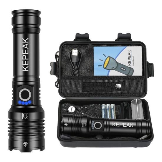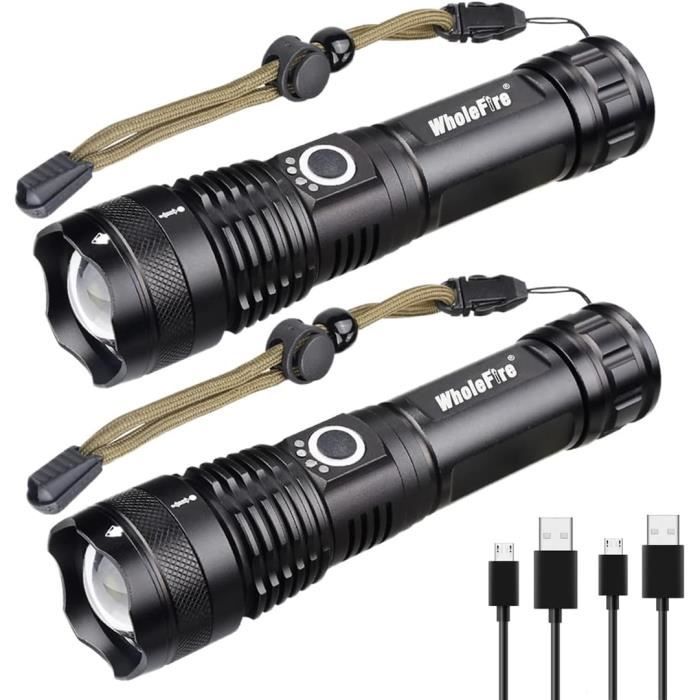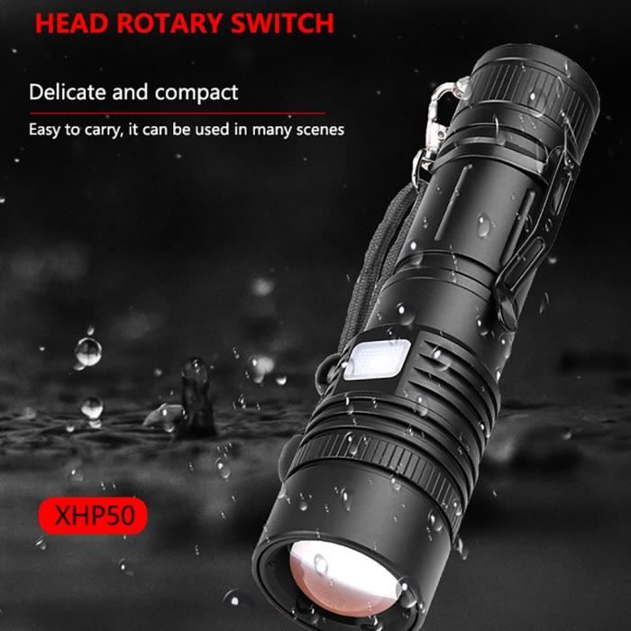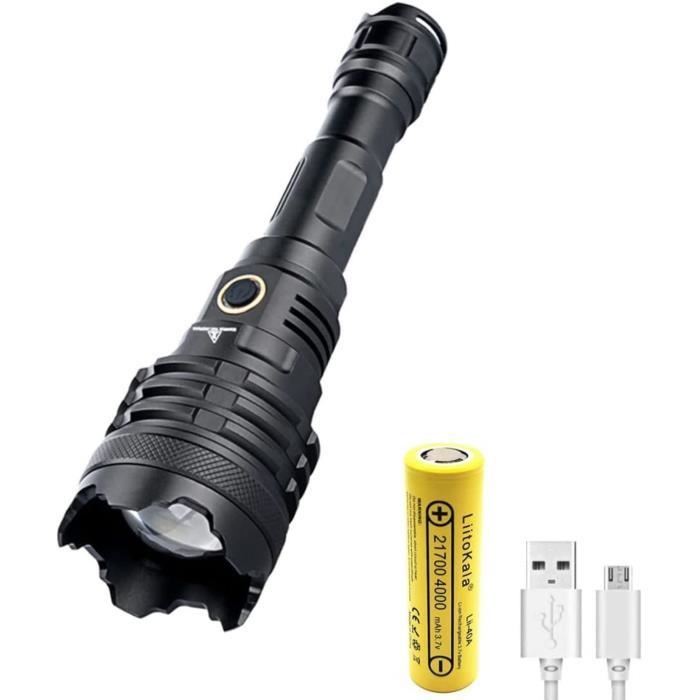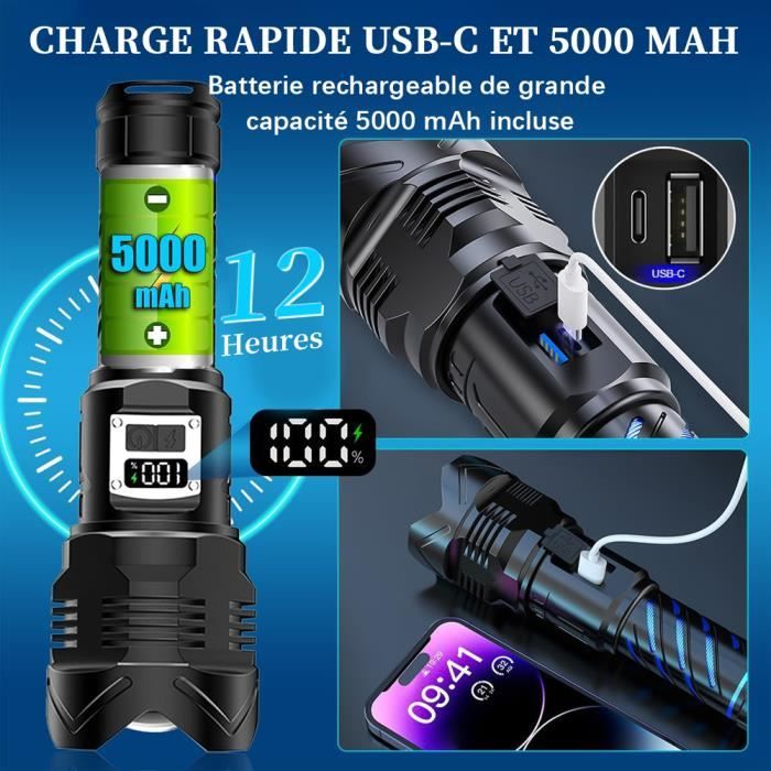 Distance d'éclairage : 0-500 m. Zoomable lampe de poche USB rechargeable ultra lumineux lampe torche... Il est conçu pour résister à des conditions difficiles et fournir un éclairage fiable. Mode : 3 modes (fort, moyen, SOS)., Objectif : lentille convexe. Rechargeable USB Portée 500m LAMPE TORCHE LED Ultra Puissante Rechargeable Tactique Lampe De Poche Zoomable EUR 29,90 Lampe LED XPE 3 Modes Forte SOS 【Éclairage longue portée】Équipé d'une puissante LED XPE, cette lampe de recherche rechargeable offre un éclairage longue portée jusqu'à 500 mètres, vous permettant de voir clairement au loin. Description : 1., Prise de vue longue avec une lumière forte, avec une distance d'irradiation de 500 m., 2., Grande portée d'astigmatisme à mise au point fixe., 3., Mèches XPH70., 4., Design de dissipation de la chaleur de requin, dissipation de la chaleur à plusieurs étapes., 5., Matériau de qualité, solide et durable. Liste des pièces : 1 lampe de poche., 1 câble USB. Durable et robuste : fabriquée en matériau ABS, cette lampe de poche est solide et durable, assurant une utilisation durable. Il peut résister à une manipulation brutale et aux aventures en plein air sans compromettre ses performances. Couleur d'émission : lumière blanche. Alimentation : batterie au lithium intégrée. UTTASU XPE Lampe torche LED zoomable rechargeable rechargeable USB : : High-TechPolitique de retour Retours & garanties légalesDemandez le retour d’un produit jusqu’à 14 jours après sa réception, sans motif, pour obtenir un remboursement complet (prix et frais de livraison) au titre du droit légal de rétractation. permet en plus les retours jusqu’au 30ème jour... Caractéristiques : Matériau de la coque : ABS., Couleur : noir., Dimensions : 13 x 3,5 cm. Il est livré avec une batterie au lithium intégrée qui peut être rechargée à l'aide du câble USB inclus, offrant plus de commodité pour une utilisation en déplacement. Super Bright 20000 Lumens XHP99 LED Torche Haute Puissance USB Rechargeable Tactique Lampe Torche Zoomable 5 Modes Étanche Torches De Poche Lumière avec 26650 Batterie pour Camping Randonnée D'urgence