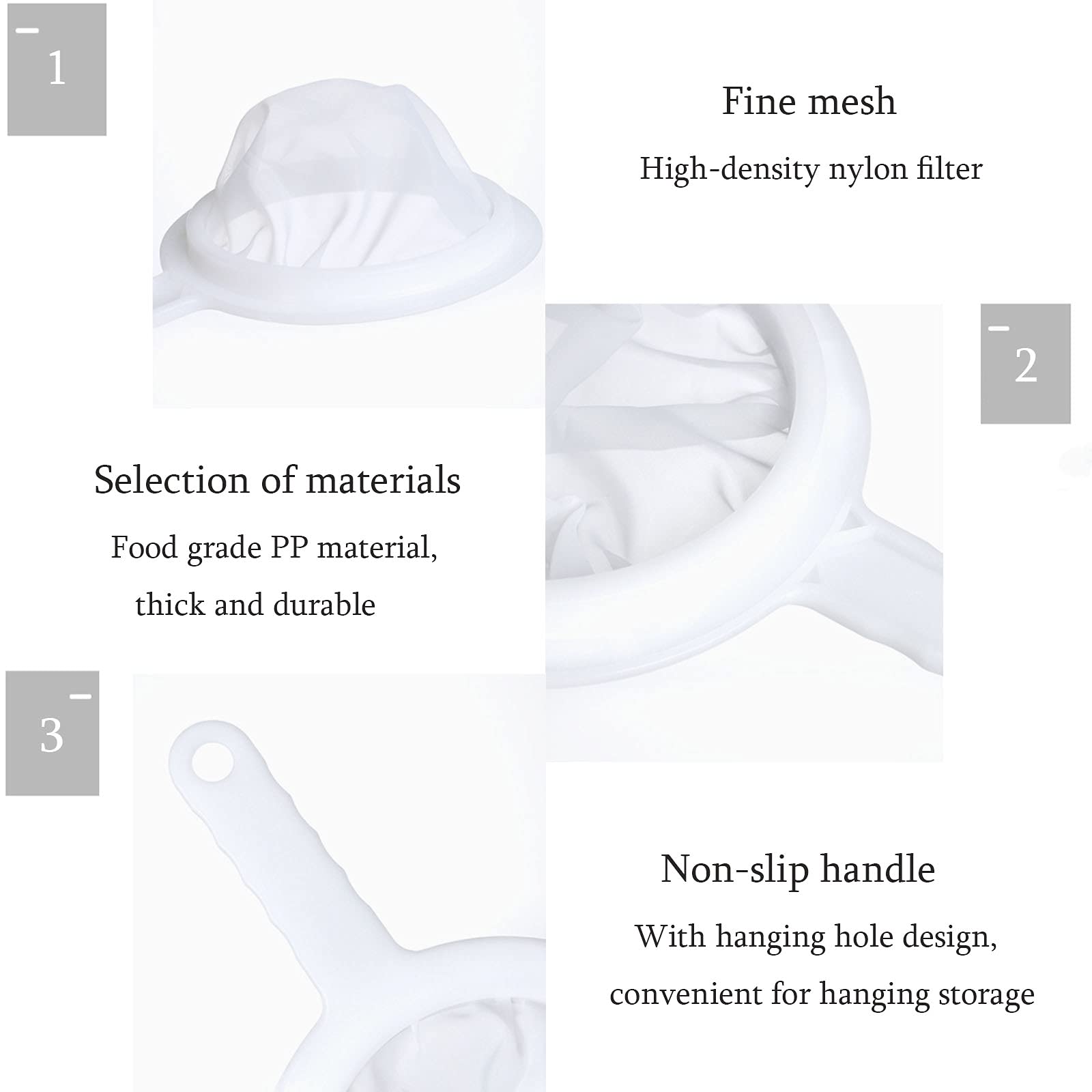 Bafnsiji Lot de 3 passoires de cuisine à mailles fines, tamis à mailles Matériau sûr: Fabriqué en PP et nylon adaptés aux aliments, résistant à la chaleur, non toxique et sans goût. Tamis Rangement Mural Filtre à Tamis Fin, Tamis De Cuisine à Mailles Fines | WhichOne Tamis Cuisine Fines Mailles Le maillage fin assure une filtration propre sans résidus Contenu Du Colis : Vous recevrez 3 filtres professionnels avec différentes tailles de mailles (100 mailles, 200 mailles, 400 mailles) pour répondre à différents besoins de filtrage Contenu de l'emballage : vous recevrez 3 filtres de Filtre à Tamis Fin, 100 mesh, 200 mesh et 400 mesh respectivement. Les mailles sont fines et régulières, le filtre est très propre et ne laisse pas d'impuretés. Notre tamis est beaucoup plus solide, résistant, durable et... Pratique et efficace pour gagner de la place dans n'importe quelle cuisine La poignée isolée protège des brûlures, idéale pour les boissons chaudes comme le café et le thé Utilisation polyvalente: Idéal pour filtrer le lait de soja, le lait, le jus, le miel et le vin. Avec un trou de suspension pour un rangement compact dans la cuisine, parfait pour un nettoyage rapide et hygiénique Design compact: La poignée du tamis est dotée de trous pour un rangement facile au mur ou dans un placard. Avec un trou de suspension pour un rangement compact dans la cuisine, parfait pour un nettoyage rapide et hygiénique La poignée isolée protège des brûlures, idéale pour les boissons chaudes comme le café et le thé Nettoyage facile: Le tamis de cuisine se nettoie facilement à l'eau froide ou chaude.