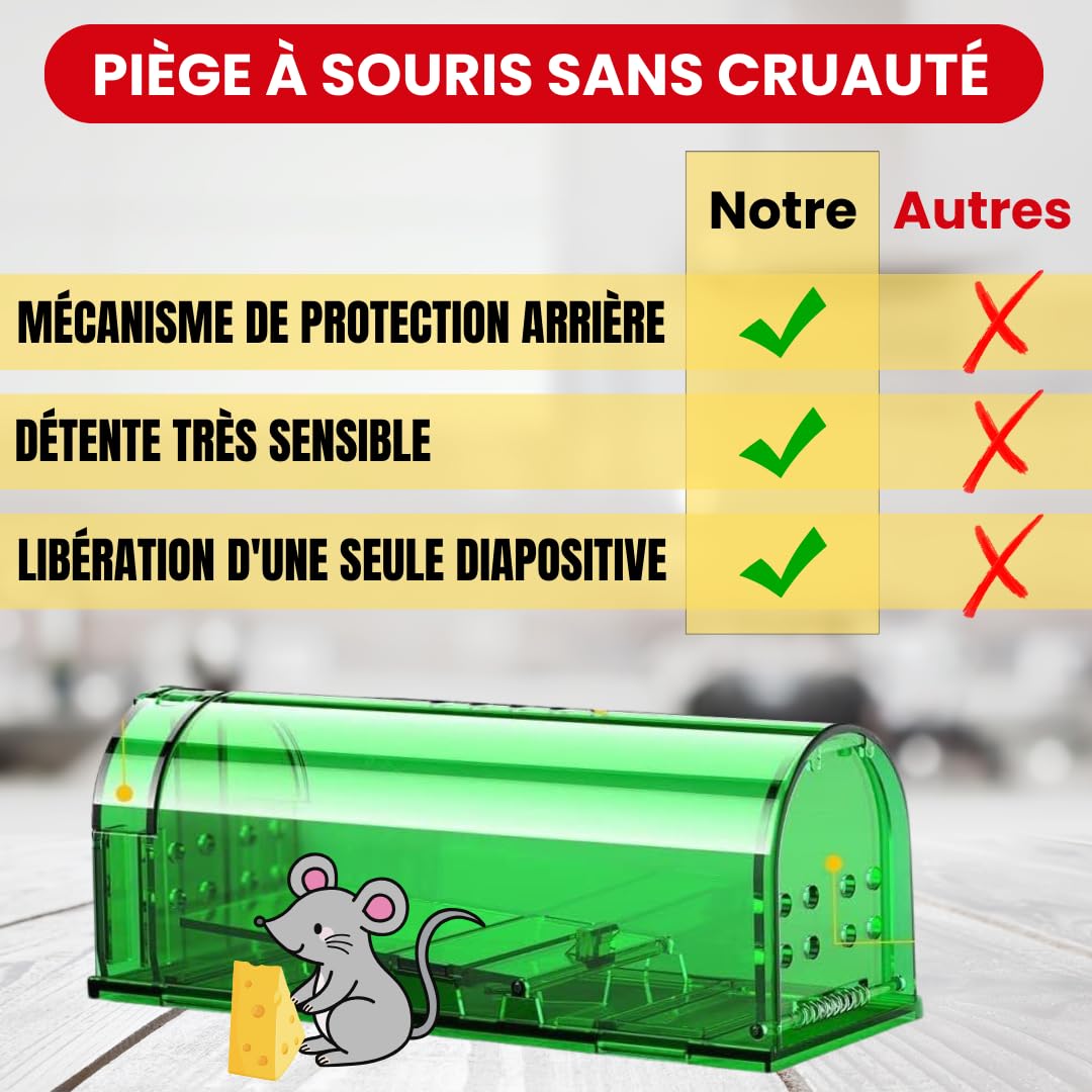 S'il vous plaît, renvoyez les invités indésirables avec humanité au lieu de les tuer. Attrape Souris Sans Cruauté AJW-Piege Souris Maison Tapetteà Souris En Plastique Attrape Souris élimination Souris Garage Maison Caractéristiques: Fonction : Haute sensibilité améliorée, efficace et facile à utiliser, aucun contact pour attraper les souris Matériau : ABS Couleur : Noir translucide Taille: 25 * 8 * 7,5 cm Contenu de l'emballage : 2 * piège à souris, 1 * manuel d'utilisation en anglais Emballage : Boîte en papier Application : Convient pour un usage domestique, commercial, résidentiel et extérieur., Remarques : Aucune Notre piège à souris est fabriqué en matériau ABS de haute qualité et durable, et le dispositif de serrage léger réduit le risque de blessure | 20 trous d... Ce piège à souris est parfait pour les maisons, les cuisines, les greniers, les sous-sols, les hangars, les magasins et plus encore. 😚【Installation rapide, facile à utiliser】- La pédale du piège à sourisest soutenue par un ressort haute sensibilité. Qqmora piège à souris intelligent sans cruauté Pièges à souris sans... 😍【Convient à divers endroits】- Notre piège à souris est fabriqué en nouveau matériau AB, de conception robuste, très adapté à une utilisation intérieure et extérieure, peut être facilement installé sous les meubles ou au plafond. 🥰【Sensibilité accrue, super efficace】- Les portes avant et arrière sont renforcées avec des plaques métalliques, les rats et les tamias ne peuvent pas échapper à ce piège humain. La souris était sur le point de tomber dans le piège, et la porte à ressort s'est fermée à temps. Piège à souris avec tapette - Sécuriposte Notre piège à souris est fabriqué en matériau ABS de haute qualité et durable, et le dispositif de serrage léger réduit le risque de blessure | 20 trous d'aération assurent une circulation d'air optimale à l'intérieur pour empêcher les souris de s'étouffer ! 🤗【Facile à nettoyer】- Le piège à souris est facile à nettoyer et réutilisable.