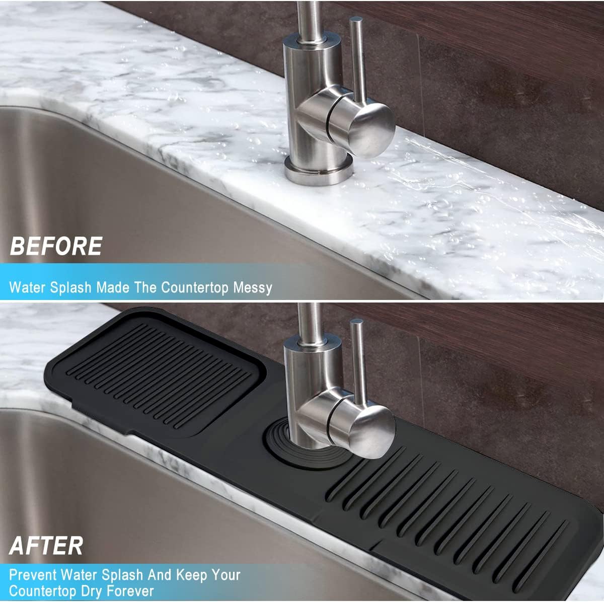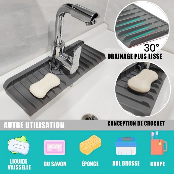 Protection évier Tapis Anti-Éclaboussures Pour Évier, Poignée En Silicone Pour Robinet, Tapis De Plateau Avec Porte-Éponge Pour Accessoires D'Évier De Cuisine, Tapis Anti -Éclaboussures Pour Évier De Cuisine Range Ustensiles évier Tapis Anti-éclaboussures De Robinet De 61cm, Tapis De Drainage Pliable En Silicone Pour Robinet De Lavabo Salle De Bain Cuisine Noir 97048767 Ce tapis de robinet en silicone mesure 45 x 14 cm et se place facilement autour du bec. Grâce à ses grilles de drainage, l'eau excédentaire s'écoule directement... Taille Du Produit: 45 × 14 cm/17,71 × 5,51 pouces. Le trou au milieu du tapis du robinet peut être découpé pour s'adapter aux robinets jusqu'à 6,5 cm de diamètre. La conception inclinée de 5° permet une vidange plus rapide et plus fluide et garde le comptoir de l'évier au sec. Taille Du Tapis d'Évier: 45 × 14 cm/17,71 × 5,51 pouces Couleur: Blanche Matériel: Silicone Fonction: Coussinet de robinet d'évier pour ranger l'évier et garder l'évier au sec L'article Contient: 1 Tapis de robinet multifonctionnel Tapis d'Évier Multifonctionnel: Ce tapis de séchage pour robinet empêche non seulement les gouttelettes d'eau d'éclabousser, mais dispose également d'une fonction de stockage, qui peut être utilisée pour placer une variété de nécessités quotidiennes, telles que : des tasses en verre, des éponges, des désinfectants pour les mains, des brosses, etc. Large Application: Ce tapis de protection d'évier peut être utilisé dans une variété d'endroits tels que les cuisines, les salles de bains, les toilettes, les cafés, les caravanes, les pubs, les fermes, etc. il peut garder les comptoirs propres et bien secs, et ajouter une touche de mode. Effet de drainage optimal : Sa pente prononcée empêche l’accumulation d’eau et accélère l’écoulement. Son motif 3D absorbe rapidement l’eau qui s’écoule de la vaisselle