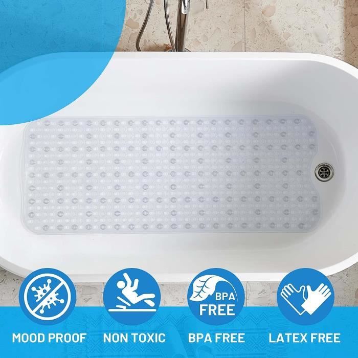 Trous Drainage Séchage Rapide Tapis De Baignoire Anti-dérapant,40×100cm De Bain Tapis De Douche Protection Baignoire Ventouses Tapis De Baignoire Antidérapant Tapis De Baignoire, 100X40Cm Extra Long Antibactérien Tapis De Bain... ● Poids du colis : 930 g., Conseils : 1., En raison des différents éclairages et affichages, il peut y avoir des différences de couleur, ce qui est normal. Les mesures étant prises à la main, les tailles indiquées peuvent varier de 1 à 2 mm. Contenu de la livraison : 1 tapis de douche antidérapant Caractéristiques du produit : ● Matériau : PVC Couleur : noir. Notre tapis de douche antidérapant pour baignoire est fabriqué en PVC souple et offre une sensation douce et douce pour votre peau. Excellent design de drainage avec trous de drainage permettant à l'eau et à l'air de circuler, ce qui permet au tapis de rester sec et propre rapidement. Disponible en 7 couleurs populaires et 2 tailles pour s'adapter à pratiquement n'importe quel thème de décoration de salle de bain, choix pour la maison, la salle de sport ou le spa. Tapis de bain antidérapant en Pvc avec 200 ventouses Tapis extra long...