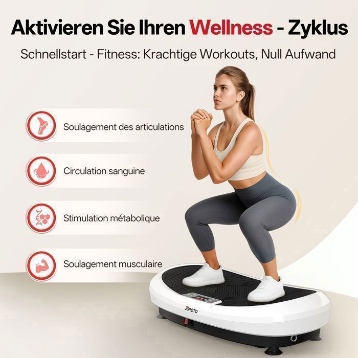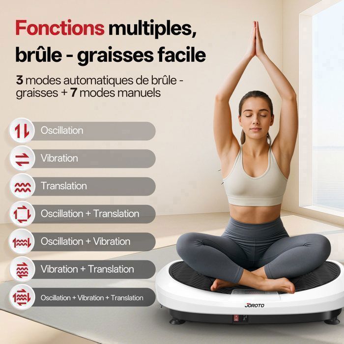 Elle aide à soulager les douleurs chroniques, réparer les blessures anciennes et améliorer votre mobilité générale – pour un bien-être physique et mental total Tapis De Marche Pliable Tapis De Marche 129.99u20ac Au Lieu De 229.99u20ac Ud83eudd70 JOROTO JV30 4D Vibration Plate | Entrau00eenement De Tout Le Corps Pour La Maison| 5 Modes D'agitation | 99 Niveaux De Vibration Plateforme Perte De Poids Compacte et pratique, cette plateforme vibrante se range facilement après chaque utilisation 【𝐂𝐎𝐍𝐅𝐎𝐑𝐓 𝐃’𝐔𝐓𝐈𝐋𝐈𝐒𝐀𝐓𝐈𝐎𝐍 𝐄𝐓 𝐑𝐀𝐍𝐆𝐄𝐌𝐄𝐍𝐓 𝐅𝐀𝐂𝐈𝐋𝐄】Cette plateforme vibrante est livrée avec une télécommande pour une utilisation sans effort. Son design antidérapant et sa structure ABS robuste assurent stabilité et longévité. Profitez d’une garantie d’un an et d’un service client réactif et professionnel à vie. Extra Luide Wekker avec Vibration pour Gros Dormeurs et Malentendants Contrôle précis & Programmes : 9 programmes automatiques pour varier vos séances Réglage fin avec 99 niveaux de vitesse Commande simple via écran LED et deux méthodes de contrôle : ● Touches intégrées : temps / mode / vitesse / marche-arrêt ● Télécommande : démarrer / pause / mode / vitesse ± / minuterie ± / raccourcis de vitesse Sécurité & Confort : Surface antidérapante pour un entraînement stable en toute sécurité Caractéristiques techniques : Dimensions : 52 × 32 × 12 cm (L × l × H) Poids : 6 kg Charge maximale : 150 kg Alimentation : 220–240 V, 50 Hz Puissance : 200 W Contenu de l’emballage : 1× Plateforme vibrante 1× Télécommande 1× Manuel d’utilisation 1× Câble d’alimentation EU 2× Bandes de résistance 【𝐏𝐀𝐑𝐅𝐀𝐈𝐓 𝐏𝐎𝐔𝐑 𝐔𝐍 𝐌𝐎𝐃𝐄 𝐃𝐄 𝐕𝐈𝐄 𝐀𝐂𝐓𝐈𝐅】Avec cette plateforme vibrante, 10 000 vibrations équivalent à une course de 40 minutes, 2200 calories brûlées, une séance de natation ou 200 abdos. Les aimants intégrés procurent un massage relaxant pendant l’entraînement pour améliorer la circulation sanguine L’écran LED affiche clairement temps et vitesse, vous aidant à suivre votre progression à tout moment. En cas de besoin, notre équipe est là pour vous offrir des solutions rapides et 100 % satisfaisantes Explorez les bienfaits d'un entraînement à domicile avec le plateau vibrant JOROTO JV30 : analyse des fonctionnalités et conseils d'utilisation pour optimiser vos séances de fitness JOROTO JV30 Vibration Plate | Entraînement de tout le corps pour la maison| 9 modes d'agitation | 99 niveaux de vibration | avec bandes de résistance à... Elle propose 99 niveaux d’intensité réglables et 9 programmes automatiques prédéfinis, permettant aux débutants comme aux utilisateurs avancés de personnaliser leur entraînement selon leurs besoins. 【𝐈𝐍𝐍𝐎𝐕𝐀𝐓𝐈𝐎𝐍 𝐃𝐄 𝐋𝐀 𝐌𝐀𝐑𝐐𝐔𝐄 𝐉𝐎𝐑𝐎𝐓𝐎】Cette plateforme vibrante de fitness d'une capacité de charge de 150 kg dispose d’un design unique de ventouse antidérapante, garantissant sécurité et stabilité lors des entraînements de haute intensité. Idéale pour s'entraîner efficacement chez soi sans aller à la salle – la plateforme vibrante parfaite pour gagner du temps Cette plateforme vibrante a été conçue pour un entraînement à domicile efficace et confortable.