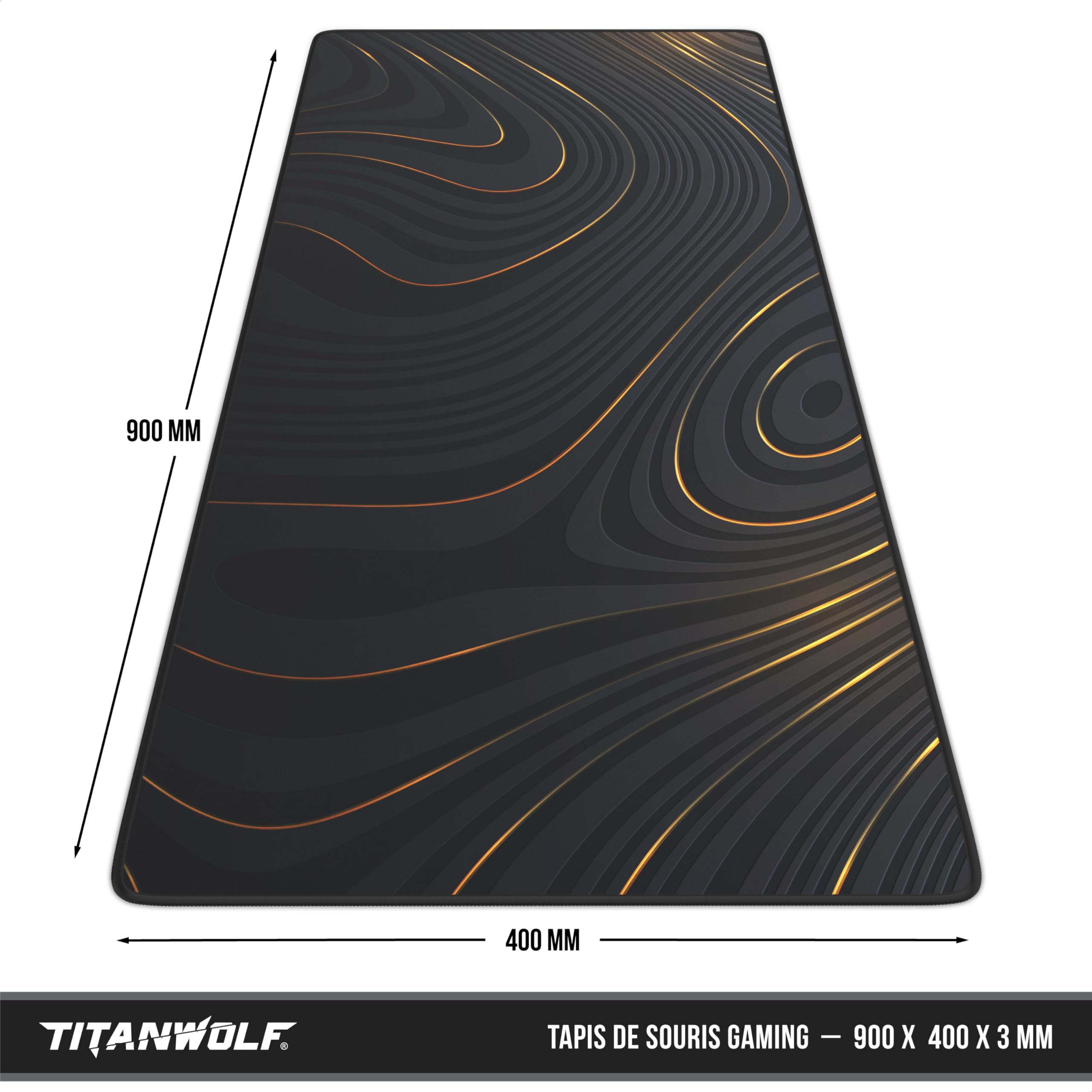 Surface en tissu finement tissée pour un contrôle optimal Dimensions du tapis de souris : 1200 x 600 x 3 mm | Poids : 836g | Couleur : noir | Matériau : surface textile / dessous caoutchouté (antidérapant... Dimensions: 900 mm x 400 mm x 3 mm Contenu de la livraison: tapis de souris Titanwolf XXXL 900 x 400 x 3 mm Veuillez découvrir aussi les autres produits hauts de gamme de Titanwolf! La Couture de haute qualité et le matériau durable garantissent une grande longévité. Tapis Souris Gamer TITANWOLF - Global Wolf 900x400mm - Sous-Main Tapis De Souris Gaming Lavable en machine à 30°-40° Profitez de l’élégance et d’espace avec le tapis de souris Titanwolf XXXL (900 x 400 mm) Avec ses dimensions XXXL de 900 x 400 x 3 mm, vous profiteriez d'un parfait contrôle de la souris sur tout le bureau. Base gommée pour un maintien stable sur n’importe quelle surface Associez-le aux souris Titanwolf Gauntlet, Specialist et Admiral - USB Gaming Laser. Découvrez tous les autres produits Titanwolf : les commandes de vol telles que le Flight stick VULTURE et le Throttle GRIFFIN pour les simulations de vol, le support de casque et bungee SERVITOR, les claviers numériques et tous les autres tapis de souris de différentes tailles et motifs. Même avec des mouvements de bras rapides, la base gommée assure un maintien stable sur les surfaces lisses. Caractéristiques: Tapis de souris XXXL pour tout le bureau Grâce à sa base en caoutchouc antidérapante, le tapis de souris XXL Gaming Speed ne bouge pas d'un pouce. De plus, sa faible hauteur de seulement 3 mm promet des poignets détendus même après des heures de sessions de jeu Bien sûr, vous pourriez aussi placer le clavier, le téléphone et le chargeur sur la surface. | Dimensions du tapis de souris : 900 x 400 x 3 mm | Poids : 700g | Couleur : noir | Matériau : surface textile / dessous caoutchouté (antidérapant) | Contenu de la livraison : tapis de souris Titanwolf XXL 900x400mm Speed Gaming + une garantie de 2 ans et un service après-vente à votre écoute. Tapis de souris gaming Titanwolf XXL Koi Tattoo