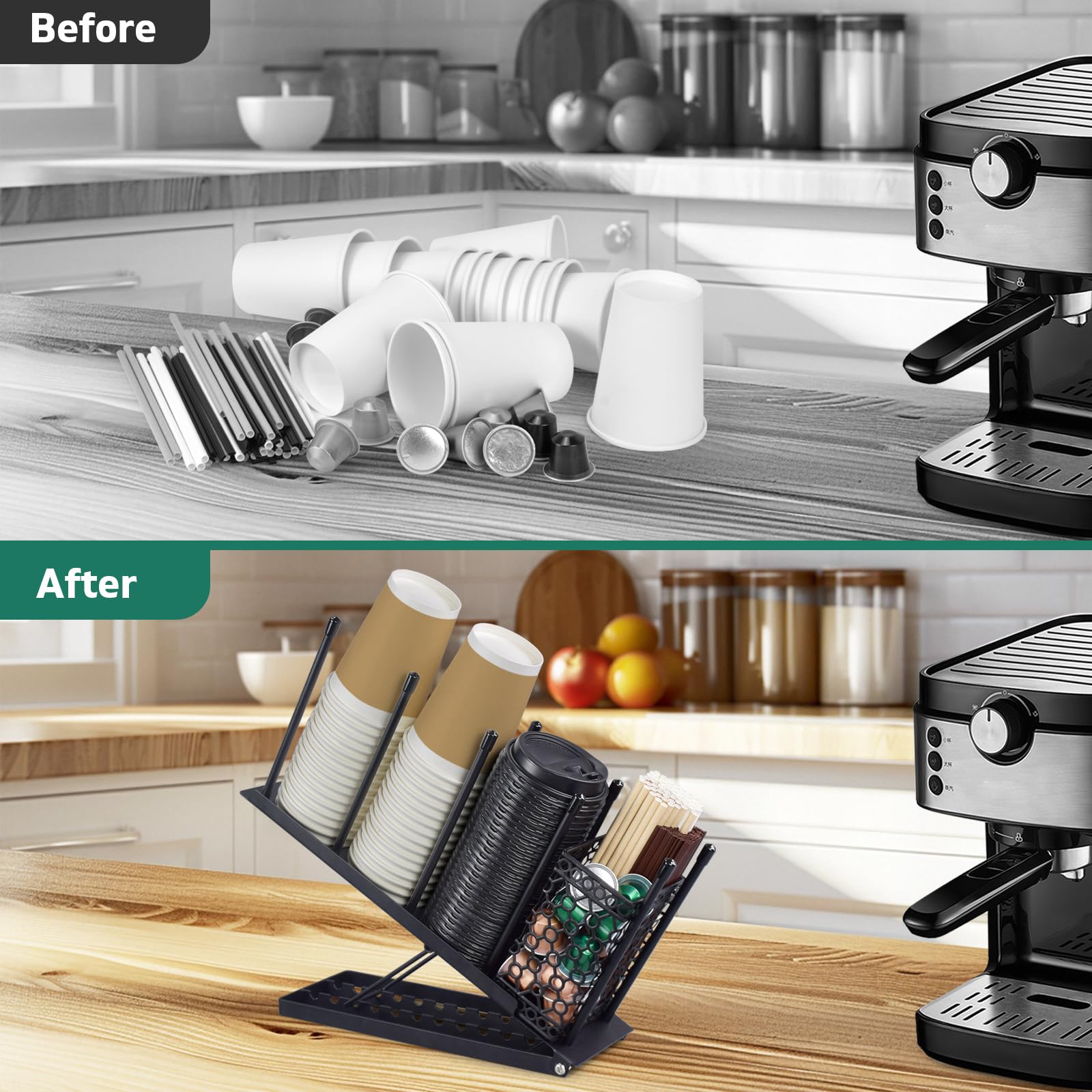 Ainsi, tous les objets restent bien rangés et n'ont plus besoin d'être recherchés lors du retrait --- 3 compartiments + 1 boîte d'accessoires : peut contenir des tasses de 30,5 à 55,8 cl, ainsi qu'une boîte de rangement métallique amovible. Avec le support de tasse à café VGECEE le rangement des tasses est simple, flexible et bien rangé --- Votre assistant fiable pour le travail et la maison ! Vous êtes toujours ennuyé par les tasses en désordre sur votre plan de travail ? Vous avez du mal à trouver la bonne taille de tasse pendant les heures de pointe au café ? L'espace dans votre coin café à la maison est-il limité, de sorte que les tasses et les accessoires sont dispersés de manière désordonnée ? Pourquoi choisir notre support de tasse à café réglable ? --- Réglage de la hauteur à quatre niveaux : ajustez la hauteur de l'étagère en fonction de vos besoins pour un accès facile. Distributeur Tasses Café Organisateur De Couvercle De Tasse à Café Jetable, Grilles De Tasses En Plastique Organisateur Pour Bureaux 94400109 Rangement Couvercles Et Accessoires Café --- Durable et stable : la construction en métal de haute qualité est indéformable et résistante à la corrosion. Zone boissons au restaurant : gestion centralisée des récipients et ustensiles. Il suffit de serrer les supports pour terminer le montage, aucun outil spécial ou connaissance technique n'est nécessaire, ce qui permet d'économiser du temps et des efforts Il prend peu de place tout en offrant beaucoup d'espace de rangement. Couvercle pour tasse à café - Le Coin du Barista --- Fond extensible : rangement pratique du sirop de café, des sachets de sucre, des garnitures de mousse de lait et d'autres accompagnements. Nombreuses utilisations possibles : Comptoir au café : organisez différentes tailles de tasses pour un service efficace. Son design élégant s'adapte à un intérieur moderne et souligne à la fois le professionnalisme et le goût Sa surface lisse se nettoie avec un simple chiffon et offre une excellente résistance aux taches et à la saleté Robinet Distributeur de Boisson de 1/2 Pouce avec Joints pour Tasse à... Disponible en ligne Support Réglable En Métal Noir Pour Tasse Et Couvercle Pour Station De Café, Distributeur De Gobelets En Papier à 4 Compartiments... --- Facile à installer : complet avec tous les composants nécessaires, aucun outil complexe n'est nécessaire pour le montage. La construction en métal robuste assure une grande résistance et un nettoyage sans effort : le distributeur de couvercle en métal renforcé pour tasses à café dispose d'un cadre stable. Spécification : Matériel: acier Dimensions : voir photo., Couleur : noir. Il est résistant à la rouille et à l'usure et conserve sa forme même en cas d'utilisation prolongée sans se plier ni se déformer. Design simple pour un montage rapide : le kit comprend 1 support de tasse à café, 6 tubes en acier, 2 étagères, 12 vis hexagonales, 4 écrous, 1 clé hexagonale et 1 tournevis hexagonal. Boutiques de thé à bulles : stockage uniforme des ingrédients et des accessoires pour garder les plans de travail bien rangés.