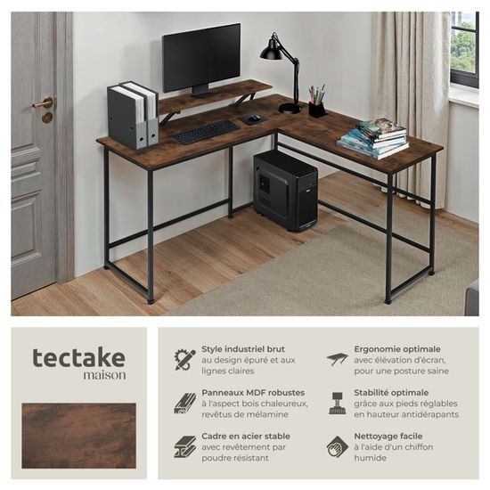 Le revêtement mélaminé du plateau rend ce bureau de travail incroyablement facile à entretenir. Panneau de particules stable avec revêtement mélaminé Que ce soit au bureau ou à la maison, pour créer un espace de travail productif, une ambiance confortable est essentielle. Caisson hauteur de bureau bois chêne clair 3 tiroirs P 60 cm Essens · TecTake® Table de Bureau Design Industriel en Bois MDF & Acier Bureau Ergonomique 140x59x76... Idéal pour un bureau gamer ou un poste de travail moderne, il associe style et durabilité avec brio. Le veinage caractéristique fait ressortir la couleur chaude du bois et ajoute une touche d'originalité au look industriel. Bureau industriel en bois de teck recyclé et en métal chez So Inside PIEDS RÉGLABLES POUR UN CONFORT PERSONNALISÉ: Vous avez un sol irrégulier ? Pas de souci ! Données techniques Capacité de charge : 75 kg, Poids : env., 15,9 kg La structure solide du cadre ne nécessite pas de traverse, ce qui vous permet d'étendre librement vos jambes. Les pieds réglables en hauteur assurent une parfaite stabilité, que ce soit sur du carrelage, du parquet ou de la moquette. Stable et élégante Le panneau de particules solide, avec son revêtement mélaminé protecteur, offre une surface robuste pour tout ce dont vous avez besoin sur votre lieu de travail : il peut ainsi accueillir un ordinateur, des stylos, des carnets de notes, des dossiers et bien plus encore. Points forts Bureau épuré de style industriel Cadre en acier (LxP) : env., 3 x 3 cm Un simple coup de chiffon suffit pour garder votre espace de travail propre et impeccable. Les quatre entretoises d'angle supplémentaires contribuent à la bonne résistance de la construction. Ce bureau informatique reste parfaitement stable, même lors de vos sessions de travail les plus intenses. Idéal pour un bureau gamer ou un poste de travail moderne, il associe style et durabilité avec brio C’est la table parfaite pour un bureau moderne, un poste de télétravail ou même une table architecte. Parfait pour le télétravail, un bureau gaming ou même un espace professionnel. Distance entre le cadre transversal supérieur et le sol : env., 72 cm Que vous l’utilisiez comme bureau professionnel, table gaming ou meuble de bureau pour télétravail, ce détail rend votre expérience encore meilleure. Pieds pratiques Notre table de bureau est équipée de 4 pieds à vis pouvant être réglés sur environ 1,5 centimètres. FACILE À ENTRETENIR, PARFAIT POUR UN ESPACE ORDONNÉ: Fini le stress du nettoyage ! Pieds en plastique réglables en hauteur , Facile à nettoyer Table de bureau Flint Structure en acier laqué époxy solide et stable, montage rapide Avec le bureau moderne Flint de tectake, créez les meilleures conditions pour mener à bien vos tâches au bureau. Bureau De Travail TecTake Table De Bureau Avec étagère De Rangement Et Poche En Tissu - Bois Clair Industriel Chene Sonoma 120 Cm Bureau Design Industriel 140x59cm POLYVALENT POUR TOUS VOS BESOINS DE TRAVAIL OU DE JEU: Ce grand bureau allie style et fonctionnalité, que vous soyez un professionnel, un gamer ou un étudiant. Son plateau en panneau de particules robuste avec revêtement mélaminé est non seulement esthétique, mais aussi résistant aux rayures et facile à nettoyer. Réglage des pieds en plastique : env., 1,5 cm