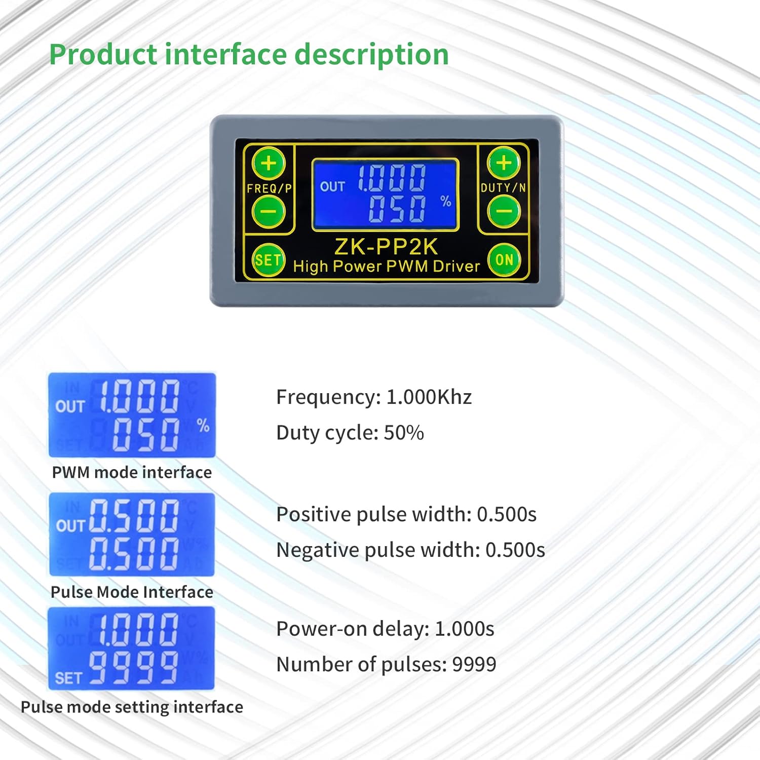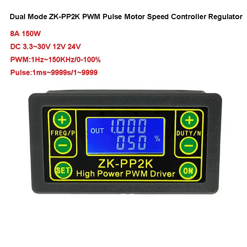Le minimum peut être réglé à 1 ms * Capacité de charge du signal : moins de 8 A (tube de commutation MOS) *Amplitude de sortie : l'amplitude est égale à la tension d'alimentation (OUT+ est directement connecté à V+ à l'intérieur du module) Contenu de l'emballage : 1 pilote de générateur d'impulsions PWM. 【Contrôle du signal polyvalent】Le pilote de générateur d'impulsions PWM est conçu pour piloter directement les LED, les moteurs, les solénoïdes et d'autres charges, offrant flexibilité et commodité dans le contrôle de divers appareils. Attention : le nombre d'impulsions ne peut pas être réglé dans ce mode, le module enverra toujours des impulsions. Fonctionnement convivial : équipé d'un bouton de démarrage et d'arrêt, ce générateur permet aux utilisateurs de contrôler sans effort la sortie et l'arrêt des signaux, améliorant ainsi la commodité opérationnelle. Les paramètres personnalisables pour la largeur d'impulsion, le nombre d'impulsions et le temps de sortie de retard offrent aux utilisateurs des options de contrôle détaillées pour diverses applications. 【Test de performance fiable】Conduisez de l'équipement, effectuez des tests de fatigue du commutateur et vérifiez la fiabilité de l'équipement avec ce pilote de générateur d'impulsions. Caractéristiques : * Tension de fonctionnement : 3,3 ~ 30 V (la connexion inverse n'est pas autorisée). * Large tension d'entrée 3,3-30 V, avec borne de câblage de 5,08 mm. Le ZK-PP2K Générateur d'Impulsions est un module compact assurant la génération et la commande d'impulsions ou de signaux PWM avec conducteur MOSFET intégré supportant jusqu'à 8A 【Spécifications de précision】Avec une plage de tension de fonctionnement de 3,3 à 30 V, une plage de fréquences allant jusqu'à 150 kHz et une plage de cycle de fonctionnement de 0 à 100 %, ce pilote offre un contrôle précis et précis des paramètres du signal. Avec deux modes sélectionnables – mode PWM et mode impulsion – les utilisateurs peuvent facilement régler la fréquence, le cycle de fonctionnement, la largeur d'impulsion, et plus encore pour un contrôle précis du signal. Caractéristiques : * Peut piloter directement les LED, les moteurs, les solénoïdes et d'autres charges. ZK-PP2K 8A 150W DC 3.3 ~ 30V 12V 24V PWM gradation moteur vitesse électrovanne équence d'impulsion cycle réglable temporisation * Gamme de fréquences : 1 Hz ~ 150 kHz, précision d'environ 2 %. * Réglez la vitesse, la fréquence et le cycle de fonctionnement du moteur. * Allumez et éteignez l'équipement de contrôle, effectuez des tests de fatigue, de chute de tension et d'autres tests pour vérifier la fiabilité de l'équipement client. Fonctions personnalisables : réglez la luminosité des LED, la vitesse du moteur et le fonctionnement de l'électrovanne avec facilité à l'aide de ce pilote polyvalent. *Nombre d'impulsions : 1-9999, ou infini (---- affiché représente l'infini) * Temps de sortie de retard : 0., 000s-9999s. ZK-PP2K peut être assorti au pilote pour réaliser la gradation, la régulation de la vitesse, l'électrovanne de contrôle, etc. ZK-PP2K peut directement conduire des charges telles que l'électrovanne de moteur électrique léger. Voir plus de détails Vous avez des questions à propos des informations du produit en français? Contactez-nous Zk Pp 1 Manual ZK-PP2K PWM Générateur De Signal Gradateur Moteur Vitesse Tech Contrôleur Sotchi Pilote Réglable Gradation Impulsion En Cas D'impasse SubKR Module électronique Test Commande * Plage de cycle de fonctionnement : 0 à 100 %, pas de 1 %. Effectuez des charges de démarrage différé, des paramètres de travail intermittents et des tests de chute de tension pour garantir la stabilité et l'efficacité des appareils connectés, ce qui le rend idéal à la fois pour les tests et à des fins opérationnelles. * Réglez la luminosité, la fréquence et le cycle de fonctionnement des LED.