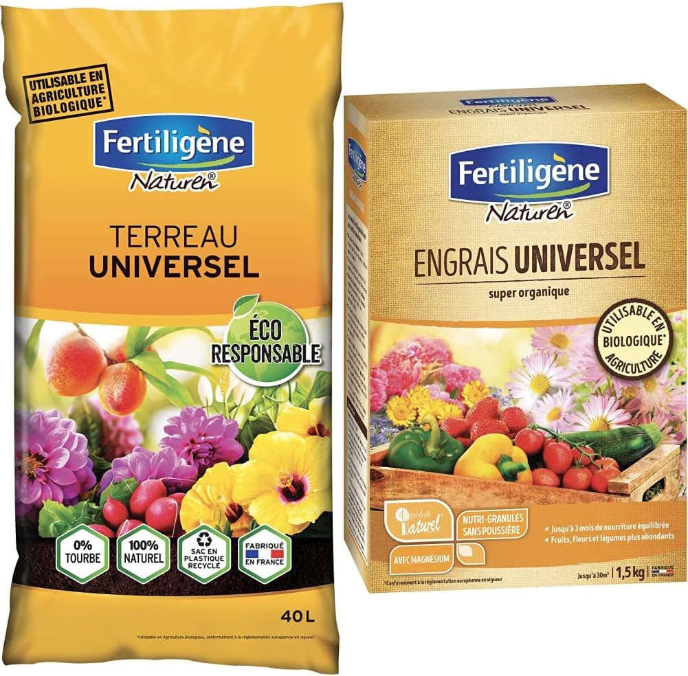 Le terreau fournit aux plantes les éléments nutritifs nécessaires à leur croissance et il peut être utilisé tout autour du jardin. Commencer la fertilisation avec un engrais Fertiligène 4 semaines après la plantation à raison de 3 fois par an. FERTILIGÈNE NATUREN - Performance Organics Terreau universel UAB 10L... Il s'utilise pur ou en mélange à de la terre du jardin. Pour tous les jardiniers attentifs à la fois à la santé de leurs plantes et à l’environnement, nos experts ont développé une gamme de produits inspirés par la nature. Planter ou semer les cultures puis arroser en pluie fine. Description du produit Depuis les années 90, Fertiligène s’est développé pour être, aujourd’hui encore, la marque leader des produits pour le jardin pour répondre aux attentes des consommateurs en proposant des solutions toujours plus naturelles et dans le respect de l’environnement. Que vous mettiez des fleurs en pot ou que vous cultiviez des tomates, cette gamme de terreaux et produits d'amendement offre tout ce dont vous avez besoin pour cultiver avec succès une large variété de plantes. Terreau Plante Intérieur FERTILIGENE NATUREN POTPO35 - Terreau Potager Performance Organics UAB Améliore Récoltes Potager Pour ne pas épuiser les sols, remplacer 50 % du terreau l'année suivante. Composé de fumier de cheval et d'engrais naturel, il assure une nutrition continue. Il s'utilise pur ou en mélange à la terre du jardin et est 100% naturel. Ce... Le compost vert participe à la fertilisation du sol car il est concentré en éléments nutritifs. COMMENT ARROSER : Utiliser de février à juin et de septembre à novembre, hors période de gel. Composé de fumier de cheval, et d'engrais naturel, il assure une nutrition continue. FERTILIGENE - Engrais potager arbres fruitiers UAB 1.2kg Arroser le soir plutôt que le matin. Des terreaux, aux engrais pour plantes en passant par les produits de soins des plantes, Fertiligène propose aux jardiniers amateurs ou plus avertis, toute une palette de solutions de qualité et facile d’emploi pour que chacun puisse embellir son espace de vie, profiter de son jardin et des bienfaits du jardinage en prenant soin de la Nature. Utilisable en Agriculture Biologique conformément au règlement UE n° 2018/848., UN MIX PARFAIT : La tourbe retient l'eau, fixe et restitue les éléments fertilisants nécessaires à la croissance des plantes. Les fibres de miscanthus favorisent l'aération du sol et le drainage pour des racines plus développées. Lorsque la plante est devenue trop importante pour pouvoir être rempotée, pratiquer le surfaçage : gratter la surface du sol sur 2/3 cm pour remplacer par du terrau, tasser et arroser. Le terreau carré potager Fertiligène Naturen est adapté à tout type de plantation dans le carré potager : fruits, légumes, herbes aromatiques, etc. Nous offrons une large variété de fertilisants, idéales pour la préparation des sols avant plantation ou semis dans les cultures potagères et fruitières. Il s'utilise pur ou en mélange à a terre du jardin. Nous avons relevé le défi d’un jardinage efficace et responsable ! Sa formulation a été contrôlée et validée par un organisme indépendant.