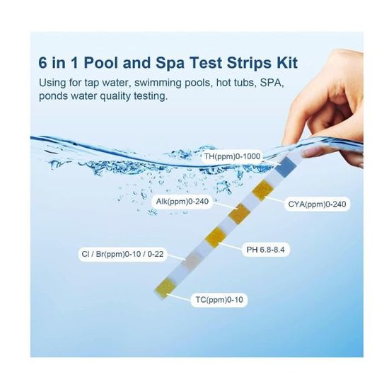 Testeur Eau Aquarium 50 Bandelettes De Test 6 En 1 Pour Piscine, Chlore, PH, Alcalinité Bandelettes Test Eau Piscine Jardin - Découvrez notre offre 50 bandelettes de test 6 en 1 pour piscine, chlore, pH, alcalinité, dureté, brome, acide cyanurique, analyse rapide. Livraison gratuite à partir de 25€* | Paiement sécurisé | 4x possible | Retour simple et rapide 50 PCS 6-en-1 Papier De Test De Piscine Chlore Résiduel Valeur PH Alcalinite Durete Bandelette De Test Acide De Bronze Exceptional 73228148 Bandes de test d'eau 6 en 1 : utilisez des bandelettes de test professionnelles pour l'eau potable, le kit de test de dureté de l'eau peut vous aider à surveiller la dureté de l'eau pour éviter la corrosion, la formation de calcaire, l'eau trouble ou la mousse excessive. Lot de 50 languettes d'analyse pour piscine, conçues pour mesurer 6 paramètres essentiels de l'eau : chlore disponible, chlore total, alcalinité, pH, dureté totale et acide cyanurique. Chaque bandelette change de couleur au contact de l'eau et se compare à un nuancier pour obtenir les valeurs correspondantes. Pratiques et rapides, ces languettes permettent un contrôle régulier pour... Facile à ranger : la qualité des bandelettes de test de dureté de l'eau maintient le stockage à long terme lorsqu'elles sont stockées au frais et à l'abri de la lumière. Utilisations multiples : les bandelettes de test de dureté de l'eau sont idéales pour les systèmes de filtration d'eau, l'eau potable, l'eau minérale, l'eau du robinet, les piscines, les aquariums, les bains à remous, les piscines, l'eau de puits. Test d'eau facile et rapide : trempez une bandelette de test d'eau potable dans l'eau pendant 2 secondes, attendez 15 secondes et obtenez des résultats instantanés en 30 secondes. Bande de test d'eau potable : bandelettes de test d'eau faciles à détecter 16 paramètres : PH/dureté/racine de carbonate/alcalinité totale/chrome/plomb/cuivre/chlore total/brome/chlore libre/nitrate/fer.