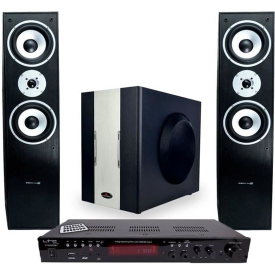 Ensemble Home-Cinéma/Acoustiques LTC Audio E1004 Hifi 5 Enceintes Noire 850w Amplificateur Stereo Usb Bluetooth Sd Fm 3701123946073 Ensemble Home-Cinéma 5 enceintes LTC E1004 Noire 850W Ampli ATM8000 Karaoke - USB/BT/RADIO FM... Ampli ATM8000 Karaoké Bluetooth Test : Ensemble Home-cinéma LTC E1004 Et Ampli ATM8000 Ampli Karaoké Bluetooth Remise de 10% - Kit home cinéma 5.0 complet avec câblages, amplificateur et 5 enceintes. 25m de câbles et 2 microphones karaoké inclus mm ( L x H x P ) : 200 x 865 x 250Poids unitaire : 8,1 Kg1 enceinte centralePuissance Max : 50 WPuissance RMS : 25 W2 voies - Type clos2 boomers de 100 mm1 médium / tweeter de 25 mm à dômeImpédance : 4 / 8 OhmsBande passante : 80 Hz à 20000 HzSensibilité : 91 dBConnexion par bornier à visFaçade amovibleDim ( L x H x P ) mm : 450 x 145 x 140Poids : 2,6 Kg2 enceintes surroundPuissance Max : 2 x 50 WPuissance RMS : 2 x 25 W2 voies - Type clos1 boomer de 100 mm1 médium / tweeter de 25 mm à dômeImpédance : 4 / 8 OhmsBande passante : 80 Hz à 20000 HzSensibilité : 91 dBConnexion par bornier à visFaçade amovibleCrochet pour fixation muraleDimensions ( L x H x P ) mm : 230 x 150 x 140Poids : 3,1 Kg la paireAmplificateur ATM8000 Hifi Karaoke 5., 2 / 4 x75W + 3 x20WTuner FMFonction BluetoothFonction denregistrement sur USB et SDAfficheur ID32 entrées de microphone avec contrôles écho, graves, aigus & volumeEntrée USB, SD & MP3Entrée optique (livré avec câble optique de 1m)Sortie casqueSorties Pré-ampli, Subwoofer & SurroundPuissance de sortie : 4 x 75 W + 3 x 20WAlimentation : AC 220-240 V ~ 50/60 HzBande passante : 20 20000 HzSensibilité dentrée : 450 mVRapport signal/bruit (S/N) : 76 dBImpédance : 8 OhmsDim: 430, Bluetooth , Port USB Caractéristiques techniques :2 enceintes colonnes :Système 2 voies et Bass Reflex arrière2 boomers à haut rendement diamètre 165 mm1 médium/tweeter à dôme directionnel 35 mmPuissance max : 2 x 350 WPuissance RMS : 2 x 180 WRendement : 93 dBBande passante : 20 à 20000 HzImpédance : 8 OhmsDim.
