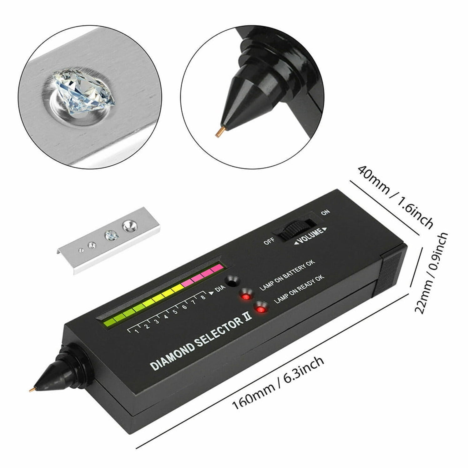 Tant que la pointe est perpendiculaire à la maçonnerie d'essai et que l'interrupteur est pressé, le résultat peut être obtenu. Test double fonction non destructif. Testeur de diamant : Matériaux : plastique et métal., Couleur : noir. Dimensions : 160 x 40 x 23 mm. Test Or Testeur De Diamant De Haute Précision Professionnel, Sélecteur De Kit Test Diamant Avec Loupe Pliable Alimentation : alimenté par pile 9 V (incluse). Ne pas tester le métal. Effet grossissant clair, affine la surface, pratique et naturel à utiliser. Large application : le stylo de test diamant peut être utilisé pour les pierres précieuses, les pièces de monnaie, les antiquités, les timbres, la lecture, l'inspection, etc. Fdit Outil d'identification des diamants Testeur de Diamant Stylo de Analyse des résultats du test : Si les lumières ont = 9 et des sons, c'est un vrai diamant. Si les lumières sont 6 ou 7, c'est du vrai jade. Le stylo de test diamant est conçu pour des tests de diamant rapides, précis et sûrs. Conception claire de l'écran et des instructions audio : ces testeurs diamant de haute précision sont équipés d'un écran clair, de sorte que vous pouvez obtenir rapidement les données utiles. Ce testeur est idéal pour vérifier l'authenticité des pierres précieuses, des pièces de monnaie, des antiquités, des timbres, ainsi que pour la lecture et l'inspection Conception claire de l'écran et des instructions audio : ces testeurs diamant de haute précision sont équipés d'un écran clair, de sorte que vous pouvez obtenir... Si les lumières sont Si les lumières sont 7 ou 8, c'est un vrai cristal. 1 x 30 x 60 x microscope 1 plateforme de test. Contenu de l'emballage: 1 testeur de diamant., 1 microscope 60x. Lorsque vous ne l'utilisez pas, la coque doit être couverte., 2., Si le voyant de veille est très sombre, cela signifie que la batterie est épuisée et que la batterie doit être remplacée à temps., 3., Si l'instrument n'est pas utilisé pendant une longue période, veuillez retirer la batterie., 4., Pour une détection précise, il est recommandé de calibrer une fois par an. Double fonction : le testeur de diamant peut vérifier l'authenticité des diamants (plus de 9), et peut également tester la dureté de l'agate de cristal de jade finie avec une dureté comprise entre 5 et 9., Accessoires loupes : 2 loupes sont fournies, l'une est équipée de 60X et d'un éclairage LED. Dimensions : 36 x 40 x 20 mm.