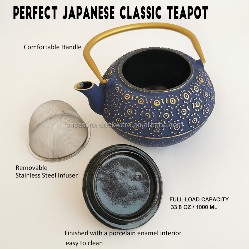 Servez un thé chaud à vos amies dans un tournemain. Trust-Théière en fonte japonaise avec infuseur qui va sur la cuisinière... Une bonne capacité peut vous apporter plus de commodité. Il est recommandé de remplir 70 % d'eau pour éviter tout débordement après ébullition., 4., Si vous ne l'utilisez pas pendant une longue période, veuillez utiliser de l'huile comestible pour enduire l'intérieur une fois, puis placez-le dans un endroit frais et sec. Théière Pour Cuisinière Théière 10 Oz Bouilloire à Thé Japonaise Tetsubin Théière En Fonte Avec Infuseur Bouilloire à Thé Pour Cuisinière Bouilloire Sans Danger Pour Feuilles Théières Fonte Le panier offre suffisamment d’espace afin que les feuilles puissent circulaire, parfait pour libérer les arômes de votre th. 0,3 LApplication : ameublement, salon de théListe des paquets :1 x théière en fer1 x filtre1 x couvercle Remarque :1., Évitez de toucher directement l’intérieur de la bouilloire en fer ; essayez de ne pas nettoyer l'intérieur avec un chiffon ou une brosse et n'utilisez pas de détergent ou de force excessive., 2., Ne rincez pas la casserole à l’eau froide. THÉIÈRE AVEC INFUSEUR --- L'infuseur aide à séparer les feuilles de thé de l'eau, qui peuvent être facilement retirées et nettoyées, simple et pratique à utiliser. Belle forme, à la fois pratique et décorative. Elle convient pour infuser des sachets de thé, du café, des tisanes, etc. La combustion à sec réduira la durée de vie du pot en fer, provoquant sa rupture et évitant une chute violente., 3., La marmite en fonte est très lourde et son poids double une fois remplie d'eau. MATÉRIAU DE QUALITÉ --- La théière est fabriquée en fer de bonne qualité, sûre à utiliser, difficile à endommager, robuste et résistante à l'usure, avec une longue durée de vie. Découvrez notre collection de théières en fonte du Japon, fabriquées selon les méthodes traditionnelles pour offrir une qualité exceptionnelle et une expérience de thé authentique. Épatez vos invités avec notre gamme d'assiettes à sushi...Nos bols japonais avec couvercle donburi sont un must-have...Nos bols à riz en céramique sont un excellent ajout à toute... Interdit de sécher sans eau dans le pot. CADEAUS IDÉAL --- La théière japonaise est un beau cadeaus pour les papas, les mamans, les amis, la famille, les mariages, les décorations, les ornements, les fêtes et les amateurs de thé. Théière Fuku en Fonte du Japon - or