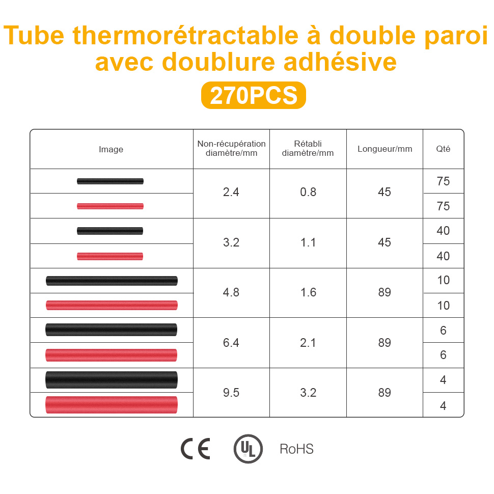 Toutes les gaines sont prédécoupées à 11 cm et peuvent être raccourcies selon les besoins Gaine Thermorétractable 31 Kit De 127 Gaines Thermorétractables - 12 Tailles - Noir - Isolation électrique - Ratio De Rétrécissement 2:1 Accessoire électronique Bricolage Facile à utiliser – Convient à tous les niveaux d'expérience Coupez le tuyau, glissez-le sur le câble et chauffez à l'air chaud - c'est prêt. Gaine rétractable de neutre et de phase Extrémités thermorétractables Capuchons thermorétractables Coffret de gaines thermorétractables Gaine spiralée Gaine tressée expansible Gaine flexible lisse [Application simple et rapide] Il suffit de glisser la gaine sur la zone à protéger, puis de la chauffer avec un pistolet thermique. [Kit pratique et économique] Contient 140 gaines thermorétractables de différents diamètres et couleurs, parfaites pour les projets électroniques, électriques ou DIY. Lot de gaine thermorétractable noire 3.2/4.8/6.4/7.9/9.5/12.7/15.7mm avec colle coef. de rétractation 3:1 avec colle l=0.5m ; 6,00 € · Assortiment de 100 gaines... Idéal pour les connexions de câbles sensibles et les applications précises telles que les projets d'artisanat, la réparation électronique ou le modélisme. Idéal pour tous ceux qui veulent obtenir des résultats nets, des utilisateurs amateurs aux amateurs de technologie. Rétractation 3:1 avec colle interne pour une étanchéité efficace et durablechauffée, offrant une excellente protection. AMIUHOUN Lot de 300 gaines thermorétractables 3 Rétrécissement efficace – Rapport de rétrécissement 3:1 Avec couche adhésive thermofusible intégrée : Lorsqu'il est chauffé, l'adhésif coule et assure une connexion solide entre le câble et le tuyau – pour une protection supplémentaire contre l'humidité, la poussière et les influences mécaniques. Résistantes à l’humidité, aux vibrations et à l’usure, elles assurent une protection optimale même dans des environnements exigeants