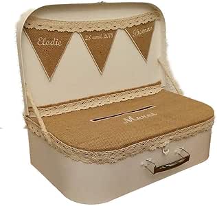 Urne Mariage Voyage de Noces - France Valise Fixe Décoration Mariage Tirelire Personnalisée : La Valise Urne Mariage Personnalisée Découvrez toutes nos boîtes à enveloppe et cagnottes pour mariage. Dans l'univers du mariage, chaque détail compte et contribue à la magie de cet évènement unique. Parmi les incontournables de la célébration, l'urne de mariage occupe une place particulière Confection de votre tirelire en forme de valise pour recevoir les enveloppes lors de votre mariage. Tirelire/urne / Cagnotte pour ariage en Fore de Valise personnalisée... personnalisable : avec vos prénoms, la date de votre mariage (police de caractère au choix) la base est toujours la meme malette peinte en blanc recouverte de lin ou de toile de jute, on brode vos prénoms et la date de votre mariage sur des fanions accrochés au couvercle.