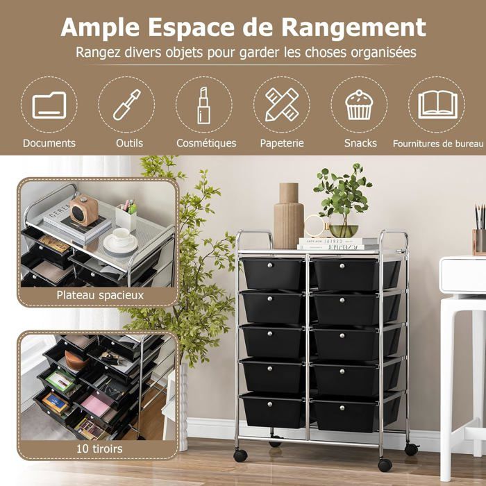 Chariot De Rangement 10 Tiroirs En Pp, Tour De Rangement,cuisine, Noir - Desserte À propos de cet article cadre en métal durable : le cadre de ce chariot de rangement pour tiroir est fabriqué en métal de haute qualité et traité avec une finition chromée lisse Chariot Organisateur Multifonction GOPLUS Chariot De Rangement 4 Tiroirs, Caisson De Rangement Roulant, Cadre En Acier, Pour Maison Organisation Maison Bureau Combinaison Libre : Le chariot de rangement est équipé de 12 tiroirs amovibles pour une classification fine. Roues Universelles Bloquantes : La partie inférieure du chariot est équipée de quatre roues universelles de 360°, dont deux sont équipées d'une fonction de verrouillage de frein, ce qui rend la poussée et la traction douces et peu fatigantes, tout en garantissant qu'il est stable et ne glisse pas lorsqu'il est stationné. GOPLUS Chariot de Rangement 4 Tiroirs, 37 x 32 x 76 CM, Tour de... Les rails des deux côtés permettent une installation et un retrait faciles et rapides des tiroirs, ce qui rend pratique l'ajustement de la solution de rangement à tout moment. Meuble Résistant et Facile à Nettoyer : Le chariot de rangement est fabriqué avec des accoudoirs en métal lisse, facilitant la poussée et la traction sans accroc. Applicabilité à Divers Scénarios : Avec un design simple et polyvalent, ce chariot est adapté à divers scénarios, tels que salon, chambre d'enfant, salon de manucure, bureau etc. La structure métallique garantit une utilisation prolongée.