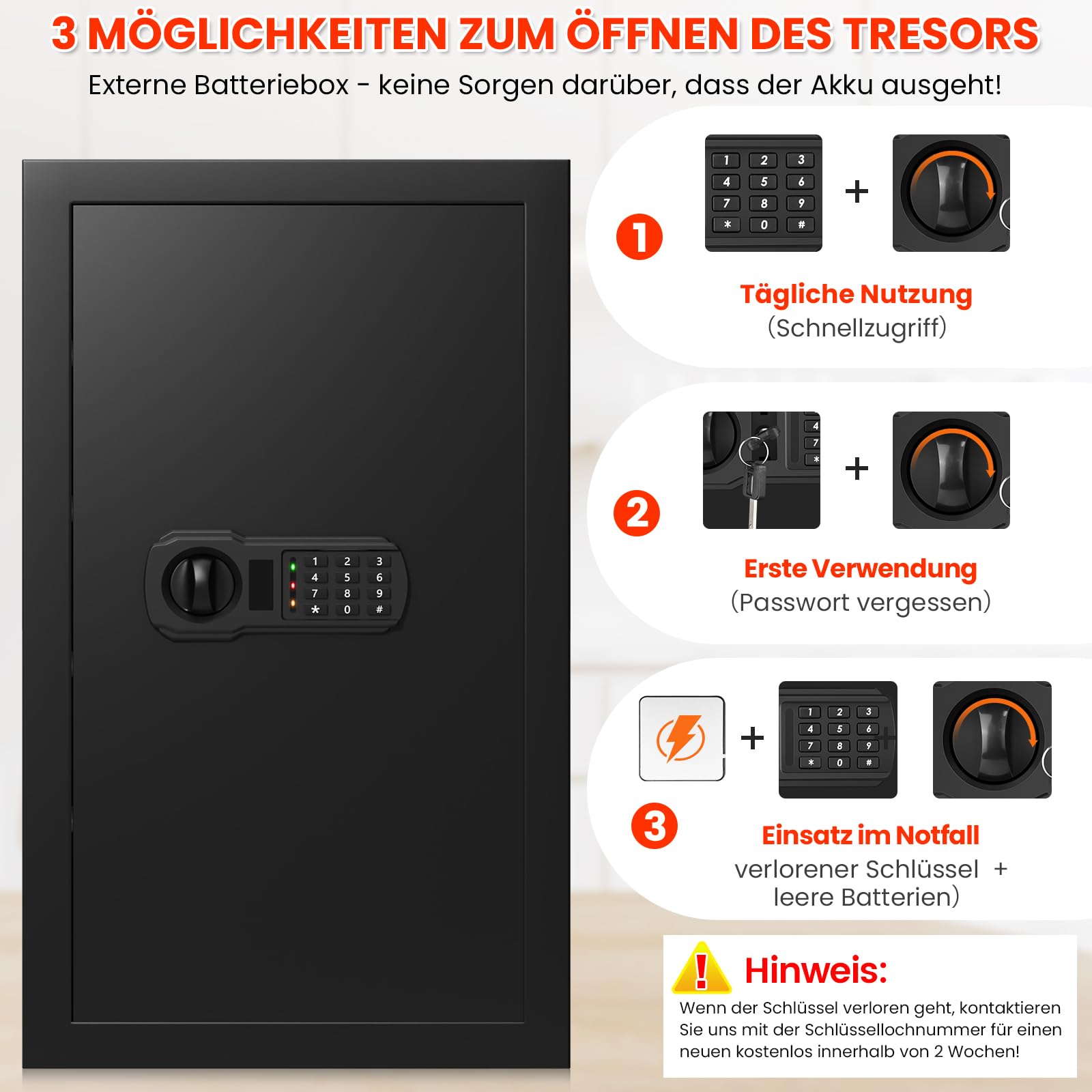 Le volume intérieur généreux offre de la place pour vos objets de valeur. Coffre-fort 80 Litres Anti-vol Tiskgg 43L Coffre Fort Ignifuge Avec Sac Ignifuge, Grand Numérique A Clef Boîte De Verrouillage Sac Ignifuge A4 Inclus Remarque : ne placez pas de clés de rechange dans le coffre-fort Le sac étanche au feu A4 fourni offre une sécurité supplémentaire pour protéger vos affaires contre les dommages causés par le feu et l'eau. Chaque serrure a un numéro de série unique pour remplacer la clé en cas de perte. Installation facile et design moderne : que vous souhaitiez l'installer ou l'installer sur un mur, des trous pré-percés et le matériel de fixation fourni, faites de l'installation un jeu d'enfant. Grand Coffre Fort Grand Coffre-fort Ignifuge De 80 L Avec Porte Une variété de designs antivol assure une protection maximale contre le perçage et le ternissement. Ce coffre spacieux pour la maison offre suffisamment d'espace de rangement pour vos objets de valeur, y compris les bijoux, l'argent liquide, les documents importants et même les armes, pour s'assurer que tout est stocké en toute sécurité en un seul endroit Les partitions amovibles rendent vos éléments importants bien rangés et facilement accessibles. Double protection de sécurité avec serrure à combinaison électronique et verrouillage à clé : le coffre-fort numérique de sécurité dispose d'un verrouillage électronique convivial par mot de passe et offre plusieurs options d'accès, des clés de sécurité et des compartiments de batterie externes pour éviter le verrouillage dû à l'épuisement de la batterie. Si vous avez des questions, vous pouvez nous consulter à tout moment et nous vous offrons un service en ligne 24 heures sur 24 Le coffre-fort ignifuge Hartmann MB080G2 est conçu pour offrir une protection optimale contre le feu et le vol, tout en restant facile d'utilisation grâce à sa serrure à clé haute sécurité Coffre-fort en acier SucceBuy avec clavier numérique et 2 clés Sac ignifuge pour argent, bijoux... Le coffre-fort est équipé d'une serrure à combinaison électronique qui permet une utilisation facile. Idéal pour ranger vos bijoux, votre argent liquide et vos documents importants en toute sécurité. Combinaison d'un coffre-fort numérique et d'un porte-documents ignifuge : 80 l grand sac étanche ignifuge est la solution ultime pour protéger les objets de valeur et les documents importants. Une combinaison de coffre-fort numérique et de Firebags peut fournir la protection la plus puissante pour votre propriété.