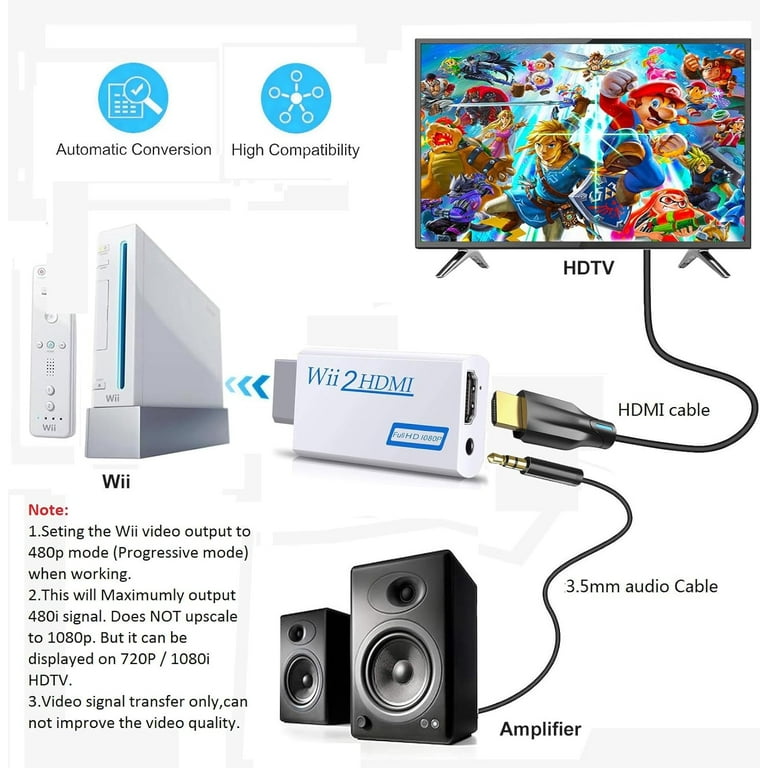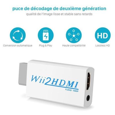 Wii Console ESynic Wii To HDMI Converter,Convertisseur Wii Vers HDMI Adaptateur Wii Vers HDMI,Échelle Du Branchement Direct Tv Hdmi CAMWAY Convertisseur RCA vers HDMI Adaptateur AV vers HDMI 2 en 1 Sortie avec Câble HDMI Prise Vers Convertisseur Hdmi, 1080p Pour Ps2 Wii Snes N64 Vhs Vcr Caméra Dvd... 【Image Haute Définition】 Profitez d'une qualité vidéo HD jusqu'à 1080p ! 【Audio Immersif】 Écoutez le son de vos jeux avec une clarté ! Grâce à la sortie audio 3,5 mm intégrée, vous pouvez connecter facilement vos écouteurs ou votre système audio préféré pour une expérience de jeu immersive Fini les câbles supplémentaires, c'est l'installation plug-and-play la plus simple 【Compatibilité Totale】 Conçu spécialement pour les consoles. Prend en charge tous les modes d'affichage (480i, 480p, 576i) pour une compatibilité optimale avec votre bibliothèque de jeux, sans réglage complexe 【Design Pratique】 Doté d'un câble généreux de 150 cm, cet adaptateur compact et léger offre une grande liberté de placement. Adaptateur Wii HDI : le top 20 des eilleurs de 2023 | eilleurs.info