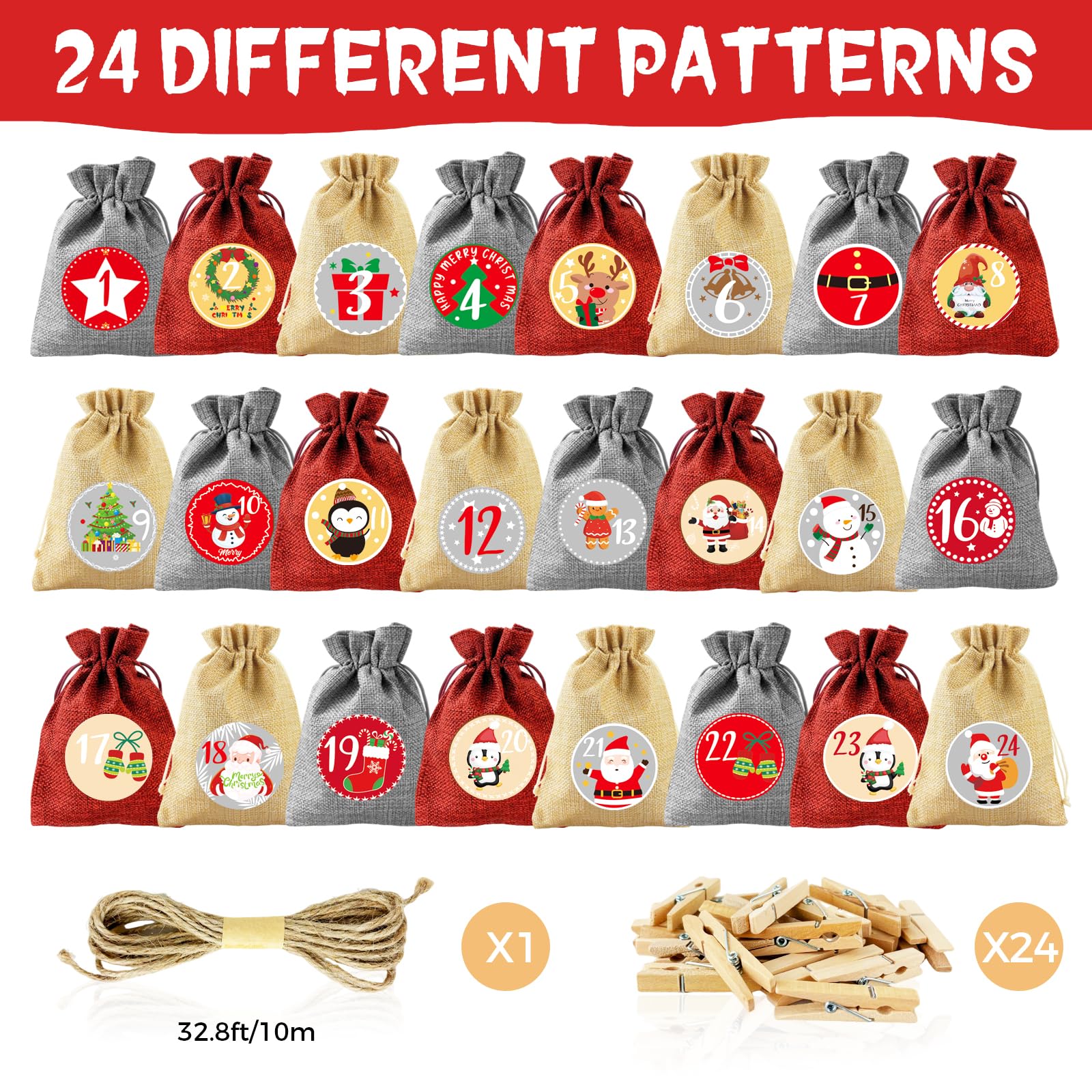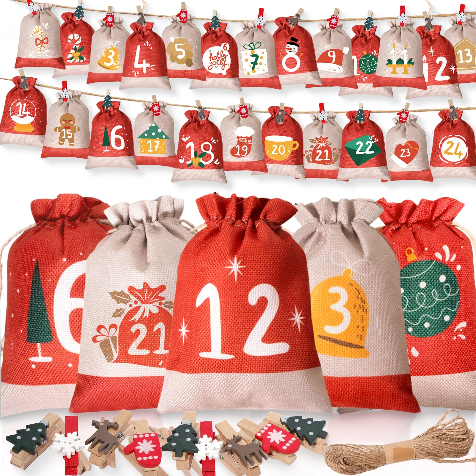 Sachet Calendrier De L'avent Elodyunhc 30 Pcs Sac Toile De Jute 10x15c Avec 30 Pcs étiquettes Et Calendrier Noël DIY 24 Calendrier de l'Avent Sac, Sac pour Calendrier de l'Avent, Sac... Calendrier de l'Avent de Noël, 24 sacs de l'Avent à remplir Motif imprimé : chaque calendrier à remplir soi-même a son propre numéro et son propre motif et contient différents éléments de Noël. Calendrier de l'Avent à replir, sac en tissu, 24 sacs en toile de jute... Vous pouvez attacher la ficelle au sapin de Noël, à la cheminée, à la branche d'arbre, à l'escalier, à la fenêtre ou au mur et utiliser le clip pour fixer facilement le sac du calendrier, sans colle ni outils. Tout le nécessaire pour un plaisir de bricolage immédiat, idéal pour votre calendrier de l'Avent personnel à remplir soi-même. Matériaux de qualité supérieure : ces sacs de calendrier de l'Avent en tissu sont fabriqués à partir de fibres semblables à celles du papier kraft, lavables et réutilisables, ne se décolorent pas et n'absorbent pas les odeurs, et le design du cordon de serrage empêche les cadeaux de se perdre. Contenu de la livraison : notre calendrier de l'Avent en tissu à remplir comprend 24 sacs en tissu numérotés en deux tailles, 24 pinces en bois solides, 24 étiquettes cadeaux inscriptibles et 10 mètres de corde de chanvre.