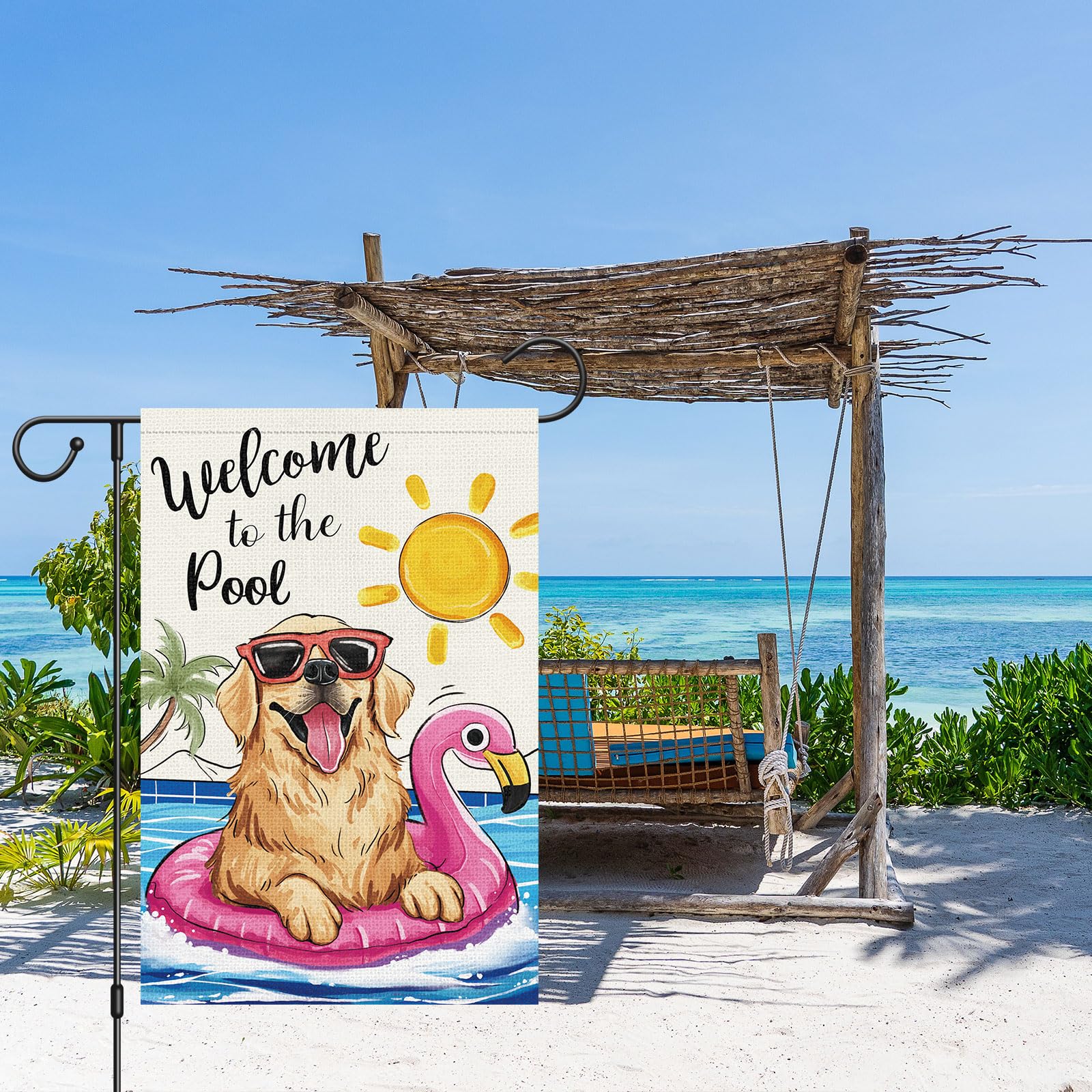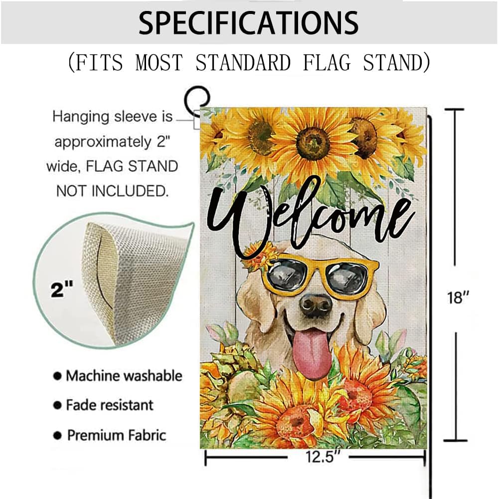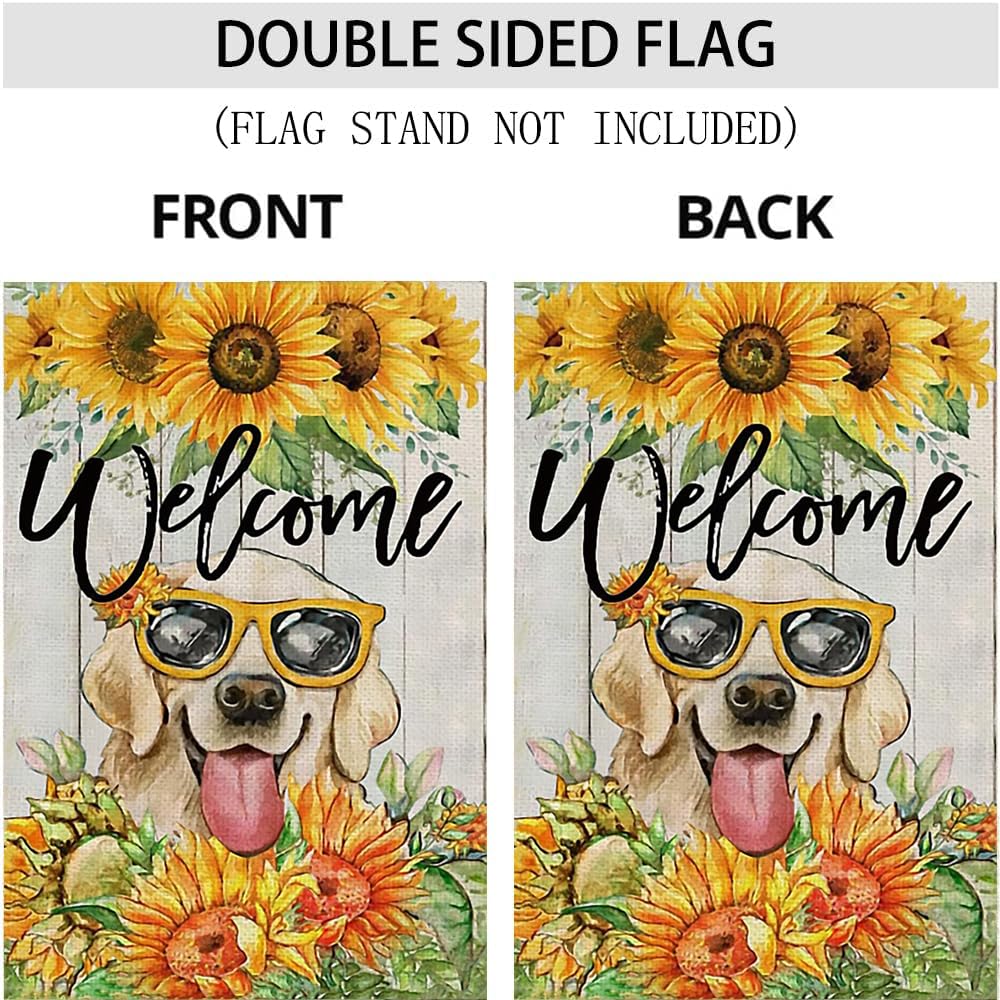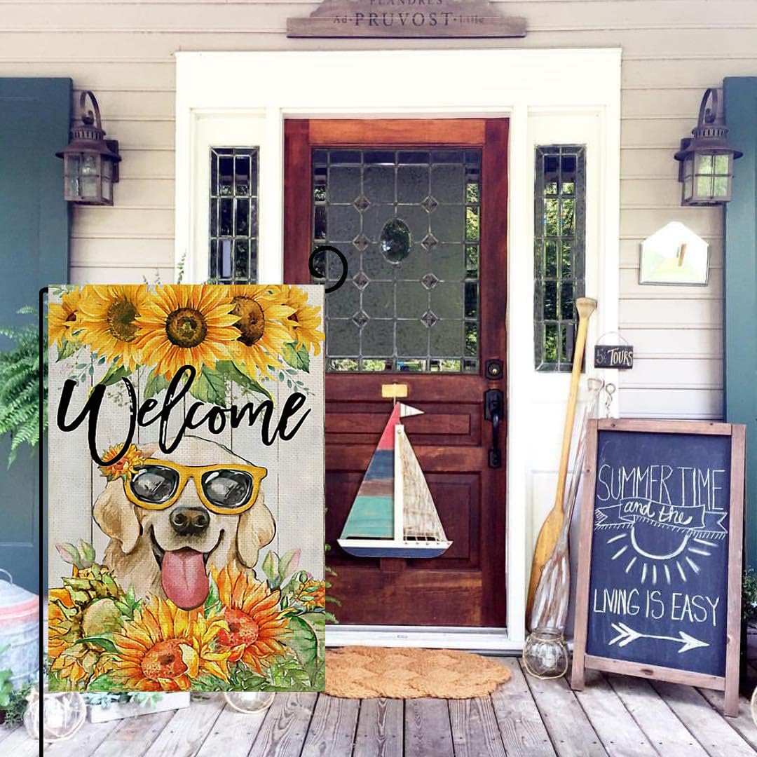 Décoration de jardin Un chiot Golden Retriever pure race court dans l... Un labrador retriever avec de belles fleurs Affiche de jardin 180x120... Drapeau De Jardin En Toile De Jute Hello Summer Sun Golden Retriever chiot allongé sur le canapé Affiche de jardin 180x120
