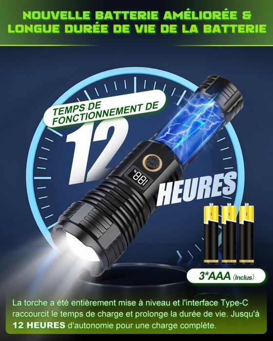 La robustesse de cette lampe saccompagne dune fonctionnalité impressionnante: ses cinq modes déclairage (Haute, Moyenne, Basse, Strobe et SOS) permettent une adaptation rapide à tous vos besoins lumineux. Birnetek® 2 Pièces Lampe Torche Rechargeable, Ultra Puissante Lampe de **Modes Polyvalents pour Toutes Situations:** Notre lampe torche puissante propose cinq modes déclairage: Haut, Moyen, Bas, Stroboscope et SOS, adaptés à chaque besoin que ce soit pour le camping ou les urgences. ZEUSFIRE Lampe Torche LED Ultra Puissante, 2 Pièces 100000 Lumens Lampe Lampe Torche LED Puissante Cette **lampe torche tactique** est conçue pour durer et résister aux conditions difficiles grâce à son étanchéité certifiée IPVous n’aurez plus jamais à vous soucier des éclaboussures ou des averses soudaines lors de vos aventures nocturnes. Quil sagisse dune situation durgence ou simplement dexploration dans lobscurité, cette mini lampe led ultra puissante saura briller dans toutes les situations. V10 Lampe De Poche Porte-Clés Led Rechargeable 13 Modes D'Éclairage... **Durabilité Maximale avec Matériaux de Qualité:** Fabriquée avec des matériaux durables, cette torche LED résistante est idéale non seulement comme lampe tactique militaire mais aussi comme accessoire quotidien pour tous besoins lumineux. Que ce soit comme lampes et lanternes pour le camping et la randonnée ou comme accessoire quotidien en remplacement des modèles classiques comme les Maglite LED ou autres poignées lourdes, notre modèle se distingue par son efficacité énergétique remarquablement améliorée. GEARLITE Lape de Poche 2 Pièces, 3000 Luens Lape Torche LED Ultra... De plus, le format compacte permet un rangement facile dans votre sac à dos ou poche lors des déplacements. En plus de sa puissance phénoménale, notre lampe torche facilite également lutilisation par toute la famille avec son design ergonomique qui convient même aux enfants (sous surveillance bien sûr). Nattendez plus pour rehausser votre expérience de survie et plein air avec ce **flashlight** innovant reproductible pour tout usage domestique également; bénéficiez du savoir-faire éprouvé Besjaar qui marie précision technique avec sens aigu du détail indispensable aux passionnés professionnels ainsi quaux débutants exigeants! Dotée d’une luminosité exceptionnelle de lumens, cette lampe torche surpasse toutes les attentes. **Design Compact et Ergonomique:** Facile à transporter grâce à sa petite taille, cette mini lampe de poche LED est parfaite pour être glissée dans une poche ou un sac à dos lors de randonnées et aventures en plein air.