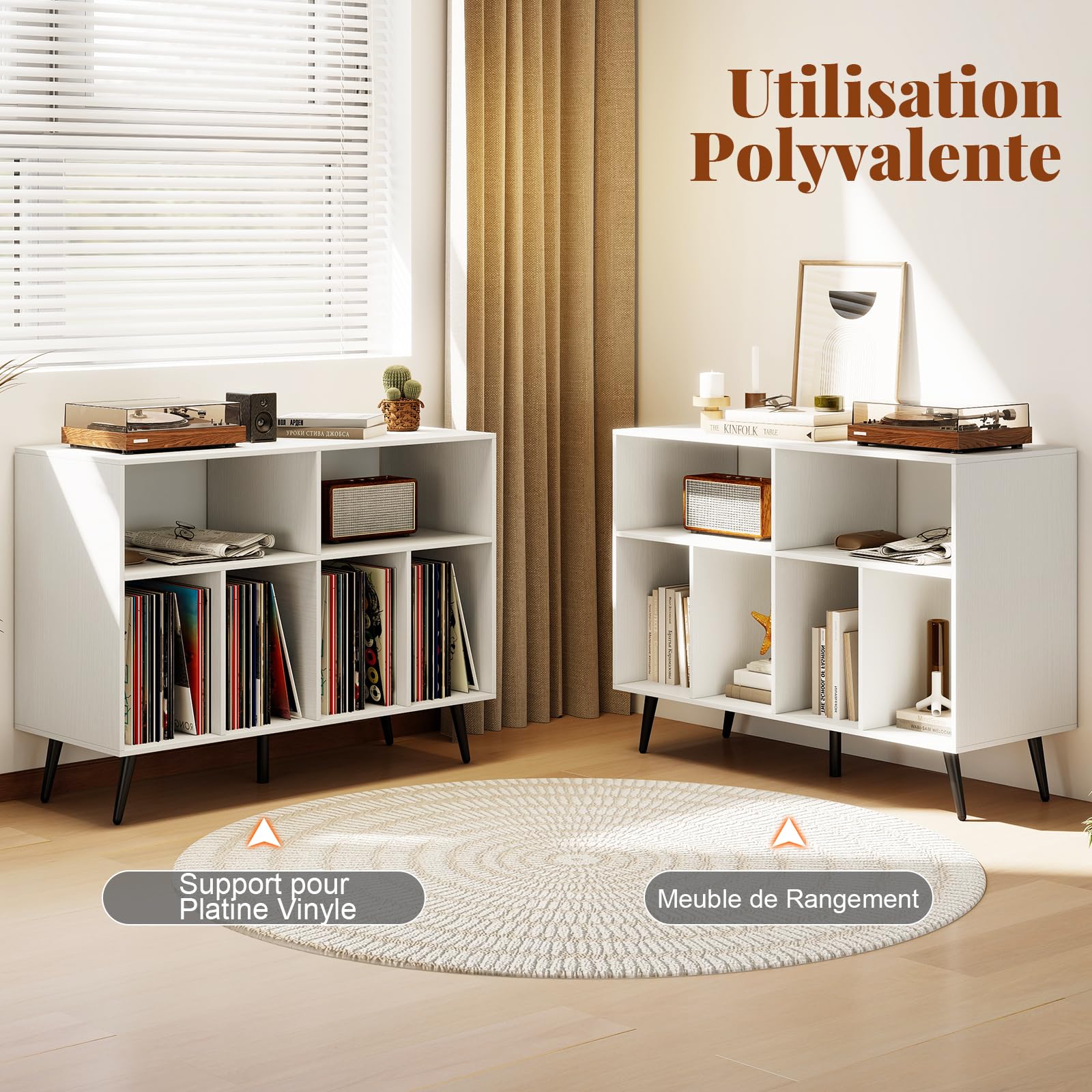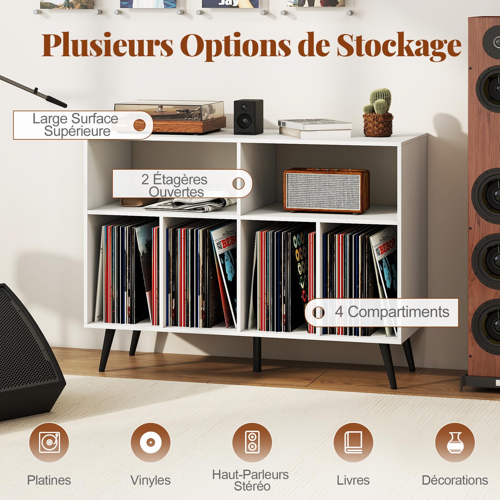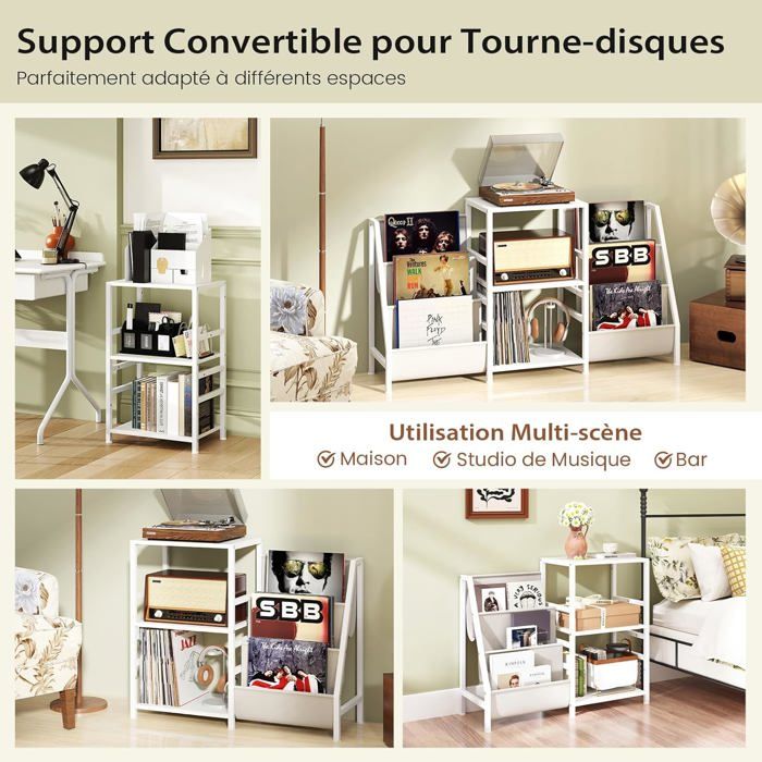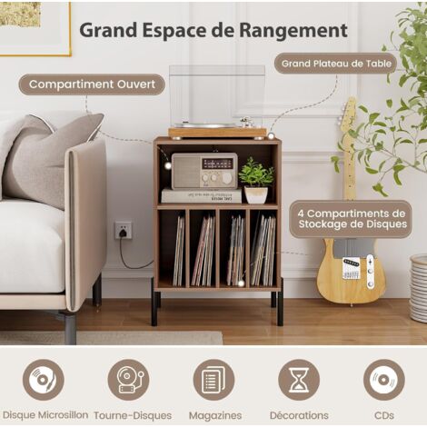 Support de tourne-disque COSTWAY avec rangement Le passage de cables garde les fils désordonnés organisés et hors de vue. Support Platine Vinyle étagère COSTWAY Support Tourne-Disque Avec Prise, Rangement Platine Vinyle Avec Meuble Recharge Intégrée USB 【Station de Recharge Intégrée】Ce meuble pour platine est doté d'une station de recharge comprenant 2 prises, 1 port USB et 1 port type-C, gardant vos appareils chargés pendant que vous profitez de vos vinyles préférés. GOPLUS Meuble Vinyle avec Station de Charge, 80x45x79,5 CM, pour Jusqu'à 150 Albums, Meuble Platine Vinyle avec Support Tourne-Disque, 6 Compartiment... Meuble de rangement, meuble pour tourne-disque avec 5 compartiments... De plus, des kits anti-basculement sont inclus pour offrir une sécurité et stabilité supplémentaires. Ainsi, vos disques vinyles seront soigneusement exposés et facilement accessibles. Ses lignes épurées et son apparence élégante ajoutent une touche de sophistication à tout espace. Cette table pour platine est dotée d'une station de recharge intime pour garder vos appareils alimentés pendant que vous profitez de vos morceaux préférés. De plus, l'étagère inférieure offre un espace supplémentaire pour les livres, décorations et autres appareils multimédia. Description : Conçu pour répondre aux besoins des amateurs de musique !