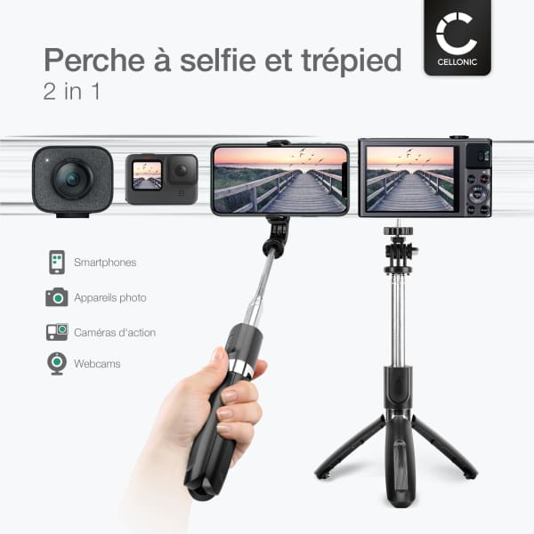 ViWAA Trépied Smartphone, 139cm Extensible Perche Selfie Trépied Stable avec Tél Selfie Stick réglable : vous pouvez faire pivoter le support du téléphone et choisir le mode appareil photo horizontal ou vertical pour obtenir le meilleur... Selfie Groupe Photo Vidéo Selfie Stick 3 En 1 Perche Selfie Bluetooth Trépied 3 En 1 - Télescopique Avec Télécommande Télécommande Selfie Amovible Trépied Perche Selfie Réglable Angle Photo 151 g/5,3 oz Fonction : support de téléphone portable, support d'appareil photo Application : pour équipement d'enregistrement DV, reflex, appareil photo reflex Version Bluetooth : 4., 0 Batterie intégrée : pile bouton de 130 mAh Modèle de batterie intégrée : CR1632 Taille de l'application : convient aux téléphones portables de 5,5 à 8,5 cm/2,2 à 3,3 pouces Liste des packages : 1 x trépied perche à selfie Tournez simplement la tête du berceau ou le support de téléphone pour prendre des photos, des appels vidéo ou des émissions en direct. Connectivité améliorée : équipée de la dernière technologie Bluetooth, cette perche à selfie assure une connexion stable et instantanée à tous les appareils iOS et Android. Design portable et compact, il se glisse facilement dans n'importe quel sac ou sac à dos, ce qui le rend parfait pour les voyages, les fêtes et les événements en plein air. Extension réglable Selfie Stick réglable : vous pouvez faire pivoter le support du téléphone et choisir le mode appareil photo horizontal ou vertical pour obtenir le meilleur angle de photo. Large compatibilité : le trépied selfie stick pour téléphone portable est compatible avec la plupart des smartphones du marché, une application simple, un positionnement précis et une plage de prise de vue extensible. En mode trépied, le centre de gravité du téléphone doit être aligné avec la perche à selfie. Comme perche à selfie normale : vous pouvez l'utiliser comme une perche à selfie normale ou comme un trépied rapide et facile.
