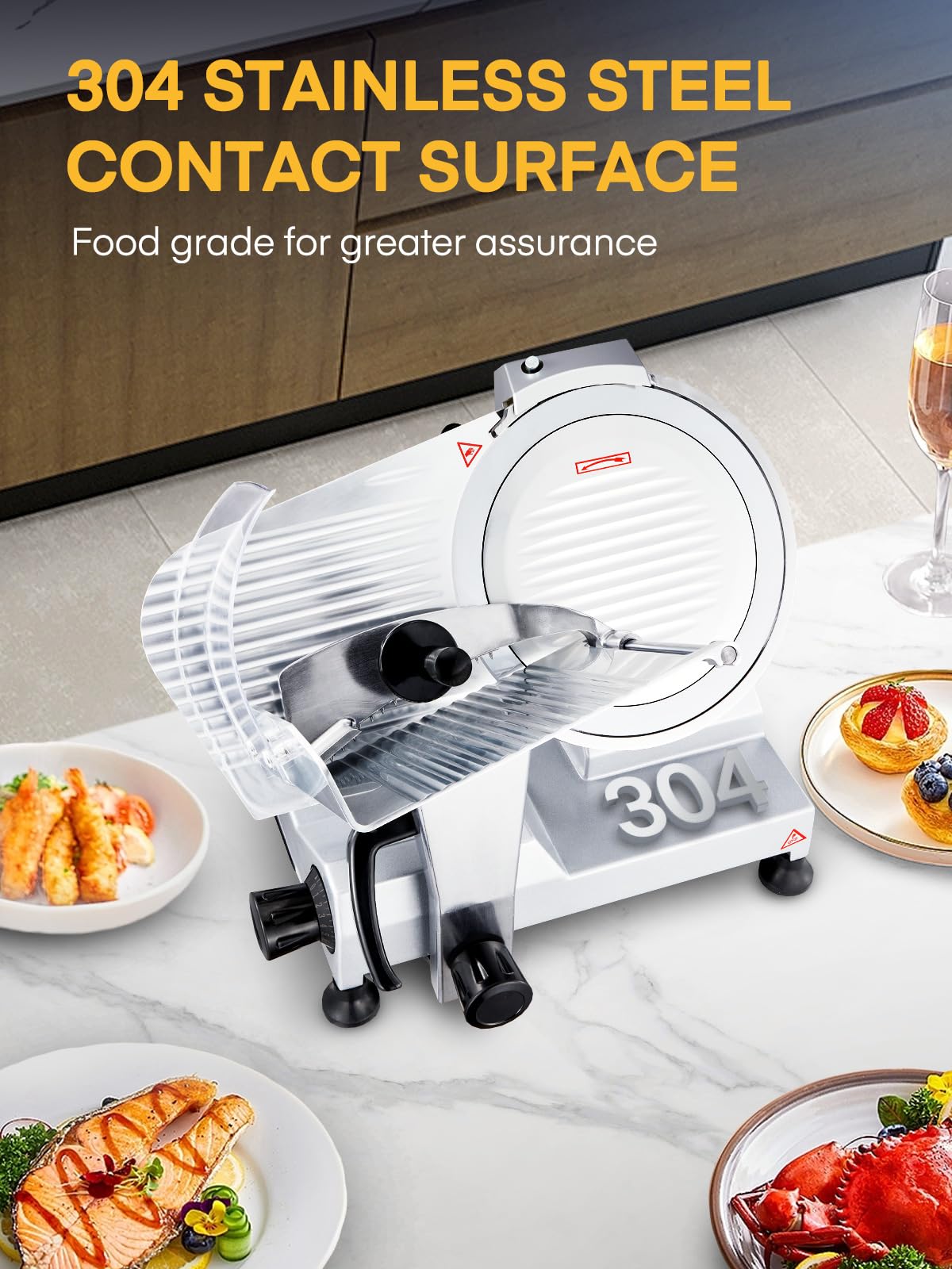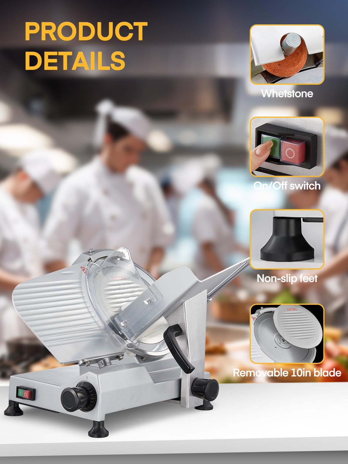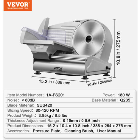 All Purpose Slicer VEVOR Trancheuse Électrique Commerciale 240 W Trancheuse à Jambon Lame épaisseur Réglable 0-12 Mm trancheuse à viande lame 250 mm noire Trancheuse à Viande, trancheuse électrique 200 W avec Lames Amovibles Associé au poussoir à aliments sécurisé, il garantit une manipulation stable et sûre des ingrédients, ce qui accélère votre préparation. Détails du produit 240W Trancheuse Électrique Commerciale à viande Trancheuse à Jambon Lame 254 mm 350-400 tr/min Trancheuse Charcuterie avec Lame en Acier Inoxydable pour Couper en Tranches Viande Fromage Légumes Vendu par : Livraison sous 2 à 3 jours ouvrés Livraison gratuite 319,99 € TVA incluse Détails de l... 【Conception de Qualité Commerciale et Conviviale】Conçue avec une base robuste en acier inoxydable et un encombrement réduit, cette trancheuse est stable tout en étant peu encombrante. 【Lame en Acier Inoxydable de Précision de 25., 4cm】Équipée d'une lame en acier inoxydable tranchante et durable de 25., 4 cm, cette trancheuse garantit des coupes nettes et uniformes à chaque fois. Conçue pour offrir des performances durables et résistante à la corrosion, elle est un outil fiable dans toute cuisine très fréquentée. 【Moteur Muissant et Efficace de 300 W】Conçue pour un usage commercial quotidien, cette trancheuse à viande est équipée d'un moteur robuste de 300 W qui fournit une puissance constante pour trancher en douceur une grande variété d'aliments, du rôti de bœuf tendre aux saucisses dures en passant par les fromages à pâte dure, avec un minimum d'effort et une efficacité maximale.