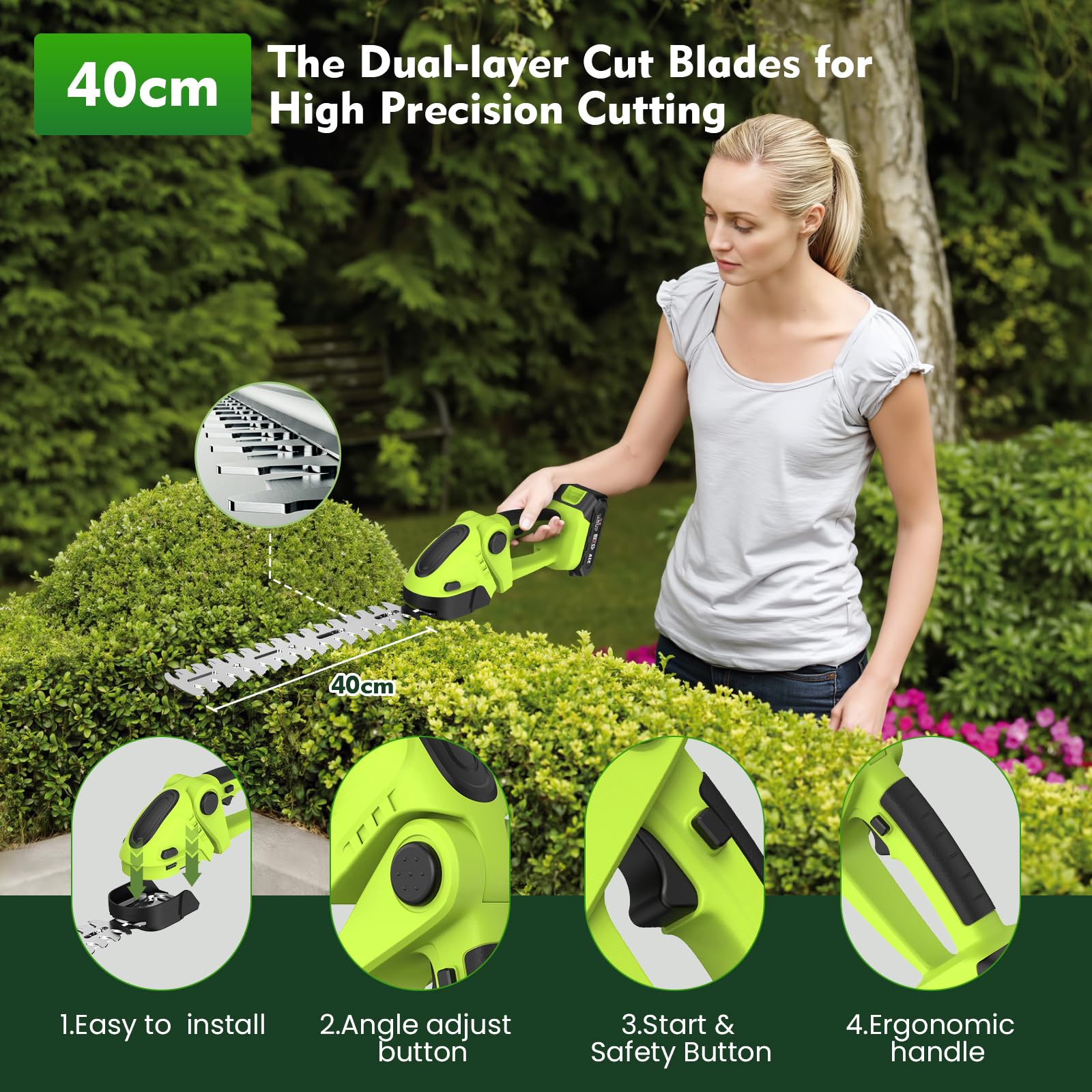 Le chargeur inclus permet de basculer entre les deux batteries, en chargeant chaque fois que vous en avez besoin sans interrompre le travail d'élagage. 1 clé à tube, 1 tournevis, 4 chaînes de 15,2 cm, 1 paire de gants, 1 paire de gants, 1 batterie rechargeable. Outil de jardin puissant 4 en 1 : combine une mini tronçonneuse à batterie, une tronçonneuse télescopique à batterie, un taille-haie batterie et un taille-haie télescopique. Cela réduit efficacement la perte de friction, rendant le moteur plus silencieux, prolonge considérablement sa durée de vie, économise l'énergie, prolonge la durée de vie de la batterie et réduit les coûts d'entretien. En outre, il facilite la coupe précise et efficace des bûches, la coupe des haies basses et l'entretien des pelouses. Taille-haie électrique télescopique - Scheppach - ETHT1000 La scie ne s'active qu'en appuyant simultanément sur l'interrupteur de sécurité et le bouton d'alimentation. Moteur puissant sans balais : cette tronçonneuse sans fil électrique de 6 est équipée d'un puissant moteur sans balais de 550 W. Contenu du paquet : 1 mini tronçonneuse à batterie, 1 taille-haie, 1 perche pour hauteur (3 sections). Taille-haie Batterie Tronçonneuse Sur Batterie Télescopique 230cm, VKE 2-en-1 Mini Tronconneuse A Batterie Avec 2 Batteries Et Un Sac De Rangement, Coupe Branche Electrique 6 Pouces Pour L'élagage Le Jardin Hochentaster Taille Haie A Batterie SEESII P6 Combo 6 Pouces Mini Tronconneuse avec Perche & 33 mm Secateur Electrique, 4-en-1 Ensemble d'Outils de Jardin avec 2 * 4000 mAh Batteries... En outre, la tronçonneuse à perche comprend 4 chaînes de rechange, ainsi qu'une clé et un tournevis, facilitant le changement d'accessoires sans souci. Système de lubrification et 4 chaînes remplaçables : nous incluons une bouteille d'huile (sans lubrifiant). Les couteaux du taille-haie en acier au carbone offrent un excellent tranchant et une grande durabilité, résistant à l'usure même avec une utilisation fréquente. Comprend des lunettes de sécurité, des gants et une bandoulière pour une protection complète et une utilisation sûre. Tronçonneuse pour Tailler Haie : Élagage et Taille Efficaces Lors de l'utilisation, en versant du lubrifiant sur la chaîne et en allumant la machine quelques secondes, la chaîne se lubrifie automatiquement, réduisant l'usure, améliorant l'efficacité et prolongeant sa durée de vie. La longueur de la tronçonneuse est de 140 cm et 190 cm, et la longueur du taille-haie est de 165 cm et 215 cm. L'angle de la tronçonneuse peut être réglé de 0° à 135°, tandis que les taille-haies offrent des réglages de 0° à 90° et 0° à 135°. Perche réglable et angle rotatif : cette tronçonneuse à perche pour élaguer les arbres dispose d'une perche extensible.