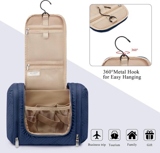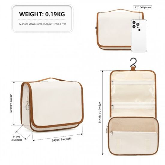 Grande Trousse de Toilette pour Femmes et Hommes, Organisateur de Grande capacité : avec une taille pliée de 11(28 cm) x 3(7,5 cm) x 7,5(19 cm), cette trousse de toilette pour hommes et femmes peut être étendue en 4... Trousse Salle De Bain Rangement Produit Suspendue Trousse Cosmétique Pour Le Voyage Beige 1231896 Trousse De Toilette Une fois dépliée, cette trousse de toilette de 6., 5L dispose de 4 poches séparées pouvant accueillir tous vos articles de toilette, accessoires de soins personnels et produits de soin pour la peau format voyage. Suspension partout : un crochet pivotant à 360 degrés vous permet d'accrocher la trousse à un porte-serviettes ou à une poignée de porte. Haute qualité : Notre trousse à maquillage est fabriquée en matériau polyester de haute qualité, imperméable, et a une texture douce et luxueuse. Le design... Les poches sont spécialement conçues avec des mailles, des bandes élastiques et une séparation humide-sec pour contenir en toute sécurité tous vos articles, des cosmétiques aux objets humides, tout en garantissant un accès facile. Durabilité : fabriquée en tissu oxford avec une doublure en polyester et chaque poche recouverte couche en PVC, la trousse de toilette est imperméable, qu'elle soit fermée ou ouverte. Elle est également parfaitement adaptée à l'organisation quotidienne de votre salle de bain ou de votre chambre à coucher à la maison. Les doubles fermetures éclair, les coutures renforcées et les bandes élastiques solides garantissent une durabilité exceptionnelle.
