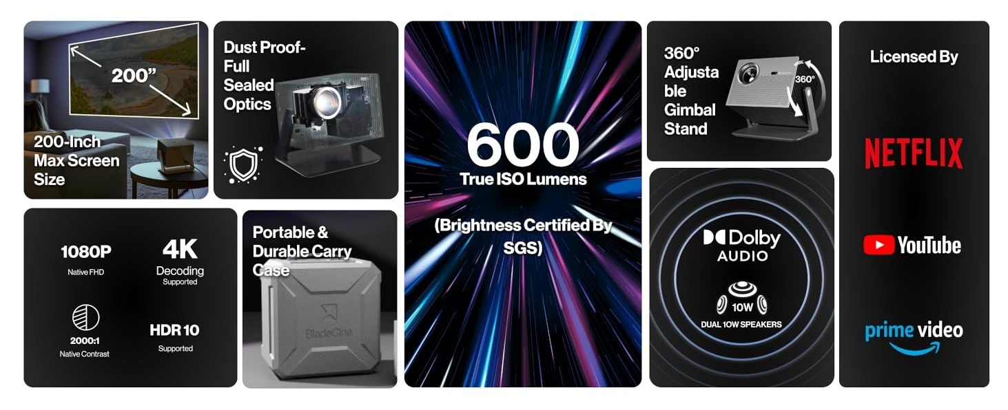 Son système de refroidissement avancé garantit une qualité d'image constante même lors d'une utilisation prolongée. Avec le WiFi intégré en 2., 4G/5G et le Bluetooth 5., 0, il se connecte facilement à votre téléphone, iPad et ordinateur. Expérience Audio 3D Surround - Compatible Dolby Atmos : Le projecteur Cube 600 est équipé de deux haut-parleurs stéréo de 10W et d'un subwoofer supplémentaire, offrant un son riche et puissant pour une expérience cinématographique immersive. Lors de l'événement, les projecteurs BladeCine ont attiré une attention considérable et ont été largement salués par les participants. Cube 600, projecteur portable 1080p avec WiFi et Bluetooth Emportez le Grand Écran Partout avec Vous : Le Cube 600 projette une image allant jusqu'à 200 pouces, vous permettant de profiter de tout votre contenu et de vos applications préférés, y compris Netflix, YouTube et Prime Video, où que vous soyez. BladeCine a brillé au salon IFA 2024 à Berlin, l'un des principaux salons mondiaux de l'électronique grand public et des appareils électroménagers. XGII oGo 2 Pro 1080P Videoprojecteur Portable, avec Support ulti... Emportez facilement votre projecteur partout, que ce soit pour des sorties en camping ou des réunions professionnelles, avec une conception assurant une protection optimale. Nos projecteurs sont conçus pour être intelligents, faciles à utiliser et offrir un excellent rapport qualité-prix. Associé à des fonctionnalités telles que la correction automatique du trapèze, la mise au point automatique, l'évitement avancé des obstacles, l'alignement intelligent de l'écran et un zoom numérique personnalisable, il offre une image parfaitement alignée et nette sur toutes les surfaces. Correction Trapèze Automatique Focus Auto Projecteur Cube 600, 1080p Avec WiFi Et Bluetooth, True 600 ISO Lumens, Support De Cardan à 360°, Clé De Voûte Automatique, Inférieur à 26 DB, Moteur Optique Scellé, écran Max Projecteur Portable Voici celui BladeCiné Cube 600 into play - un projecteur compact spécialement adapté aux besoins des débutants et des utilisateurs occasionnels Projecteur Extérieur BladeCine Cube 600 : Livré avec un étui portable en EPP.