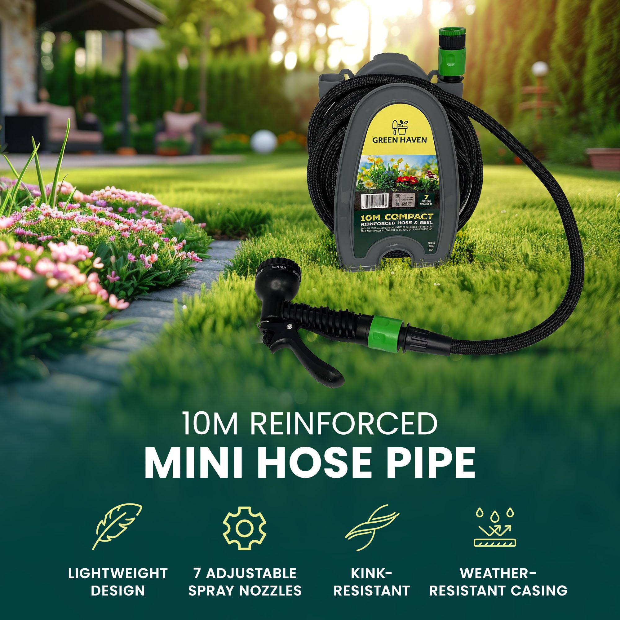 Le connecteur mâle à connexion rapide permet une connexion simple pour plus de 95 % des robinets européens, ce qui le rend extrêmement facile à changer. Les modes sont jet, brume, douche, plein, plat, cône, centre. Remarque : Veuillez retirer l'adaptateur vert monté sur le connecteur pour l'installer sur un robinet plus grand Écriture : le dévidoir compact est livré avec un connecteur rapide de 1,2 cm. Longueur du tuyau : 10 m L'enrouleur de tuyau mesure 10 mètres de long. L'enrouleur de tuyau compact est livré avec un connecteur rapide de 1,2 cm. Le connecteur mâle à connexion rapide permet une connexion simple pour plus de 95... Vous pouvez également le fixer au mur. Notre enrouleur de tuyau d'arrosage est parfait pour les jardins, les terrasses, les arroseurs, les balcons et les terrasses sur le toit. Tuyau d'arrosage L'enrouleur de tuyau d'arrosage Cuqoo est parfait pour les jardins, les terrasses, les pots, les balcons et les terrasses. Support Tuyau Arrosage Green Haven - Enrouleur Tuyau Arrosage 9,1 M Léger - 7 Buses Réglables Pistolet Arrosage 40m Enrouleur de Tuyau portatif léger, Chariot à Tuyau Vide pour arrosage de Jardin pour l'allée... La bobine d'extension est fabriquée en polypropylène, stabilisée aux UV et prolonge sa durée de vie. Équipé d'un pistolet pulvérisateur qui dispose de 7 modes de buse. Remarque : Veuillez retirer l'adaptateur vert monté sur le connecteur pour s'adapter à un robinet plus grand Il est également facile à déplacer et peut être rangé dans des espaces petits et compacts. 40m Enrouleur de Tuyau portatif léger, Chariot à Tuyau Vide pour arrosage de Jardin pour l'allée Les modes sont jet, brume, douche, plein, plat, cône, centre, vous permettent de choisir le modèle d'eau que vous voulez dans différentes situations, augmente le degré de liberté d'utilisation. Petit et compact, il peut être facilement transporté et stocké. Perfect Garden Enrouleur de tuyau d'arrosage Cuqoo Mini enrouleur de tuyau d'arrosage 10 m Idéal pour toutes les situations de jardinage Idéal pour les jardins, les patios et les terrasses Le tuyau d'arrosage CUQOO est parfait pour les jardins, les allées et les terrasses.