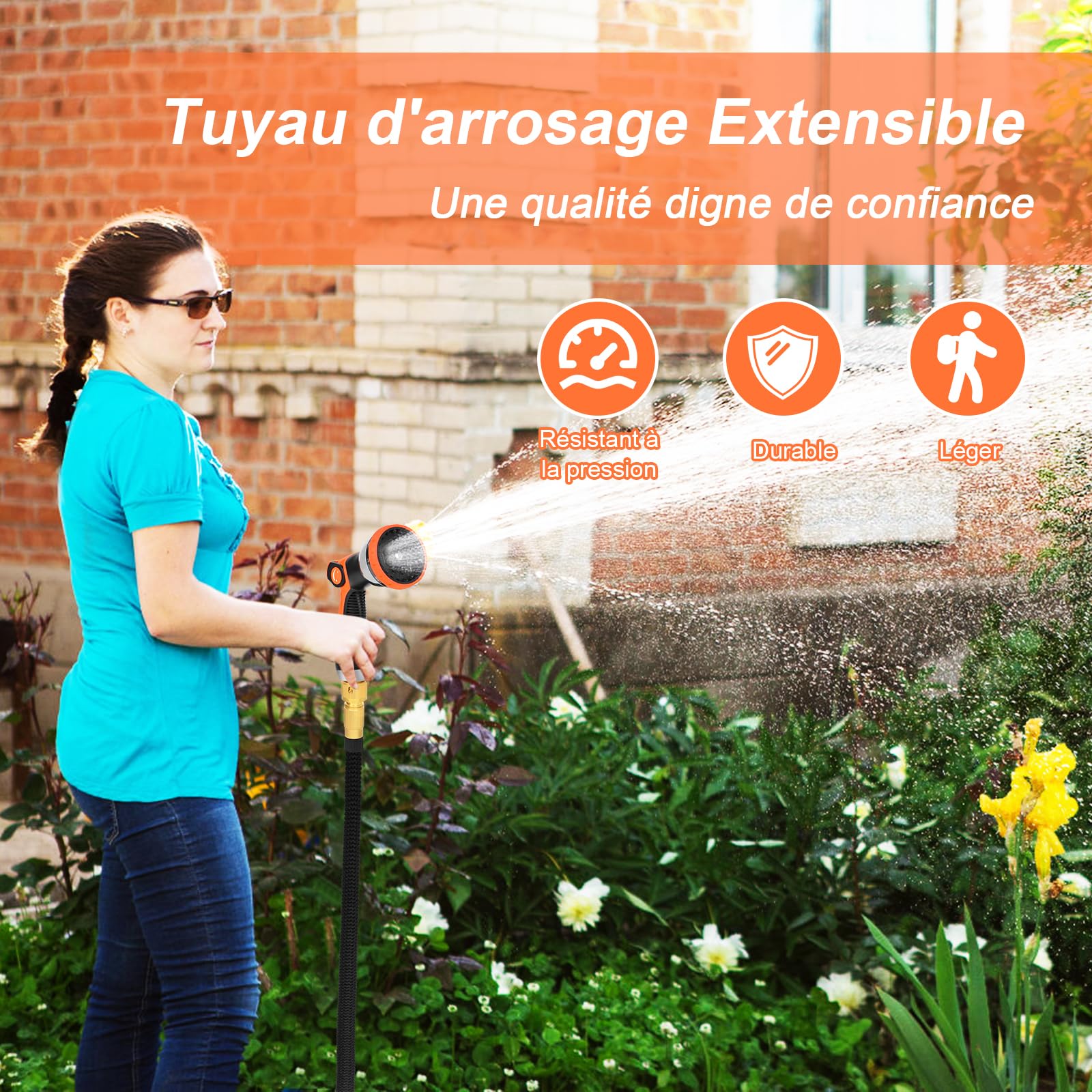 Tuyau d'arrosage extensible de 30 m/100 pieds avec 10 types de jets La poignée ergonomique antidérapante et le bouton de réglage du débit d'eau amélioré vous permettent de contrôler facilement le débit. Tuyau Avec 10 Modes Pulvérisation Tuyau D'Arrosage Extensible 45m/150Ft Avec 10 Modèles De Pulvérisation Tuyau Jardin 30m 【Buse Multifonction, Facile à Régler】Prend en charge 10 Modes différents et fait pivoter le déflecteur pour répondre à différents besoins d'utilisation, adapté à diverses tâches telles que l'arrosage des plantes, le lavage de voiture et le bain des animaux. Tuyau D'Arrosage Extensible De 7.5M 15M 30M 37.5M 45M 60M Avec 8 Mode... YMYNY Tuyau d'arrosage extensible de 30 m/100 pieds avec 10 types de... 【Large Gamme D'utilisations et Rangement Facile】Ce tuyau d'arrosage extensible est parfait pour un usage domestique et professionnel, notamment pour le jardinage, l'arrosage des pelouses, le ménage, le lavage de voiture, le lavage des animaux, etc. Le tuyau est résistant à l'usure et à la corrosion ; Il ne se fissurera pas et ne se déformera pas sous l'effet des variations de température, garantissant ainsi une longue durée de vie. Il est livré avec des sacs et des crochets pour un rangement facile après utilisation. Lorsque la pression de l'eau est suffisante, le tuyau se dilate progressivement jusqu'à tripler sa longueur initiale. Léger et flexible, il résiste aux plis, est facile à nettoyer et tient confortablement dans la paume de la main. 【Extensible 3 Fois】Notre tuyau d'arrosage est fabriqué en latex de qualité supérieure, ce qui lui confère une excellente élasticité.