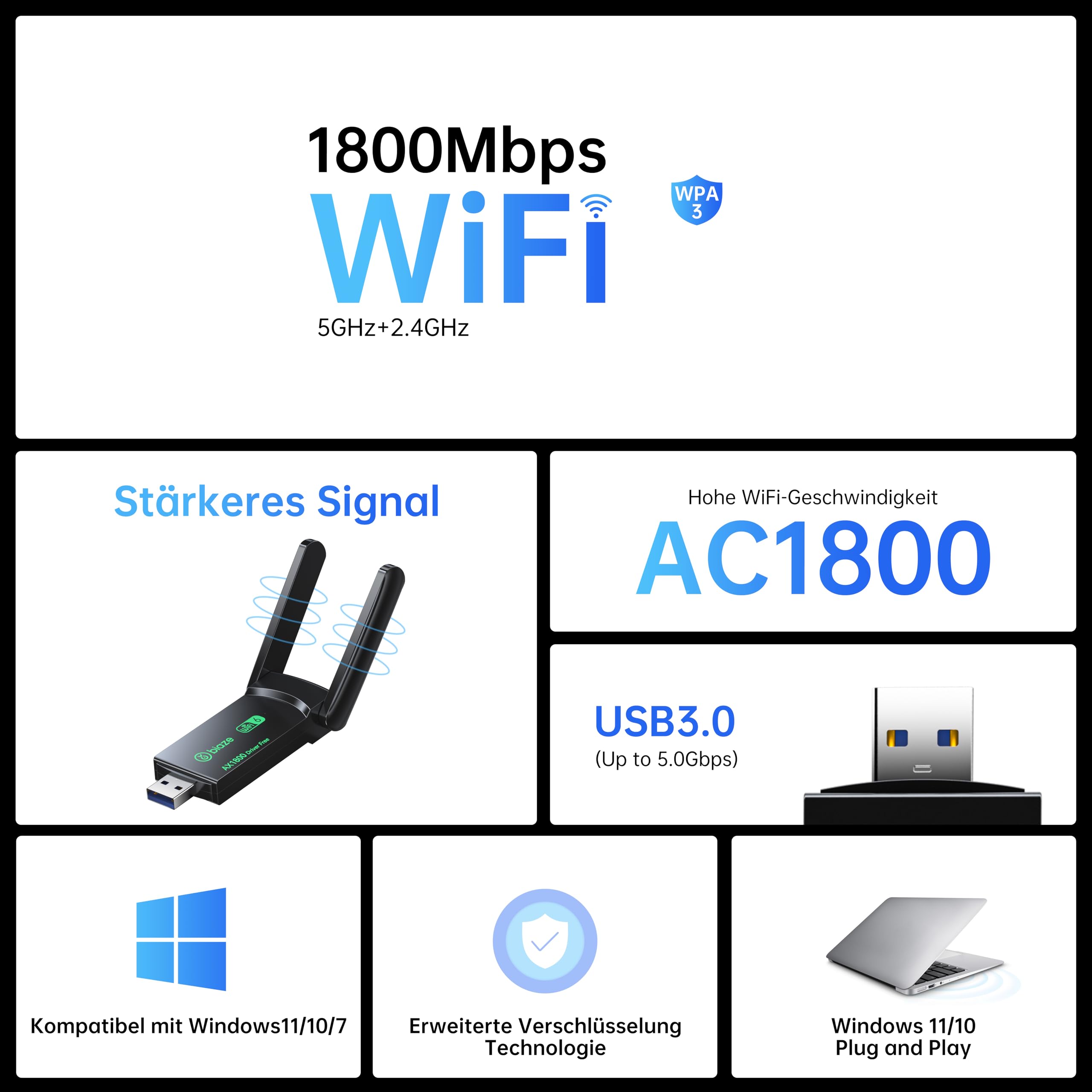 Clés Usb Biaze WiFi 6 Dongle USB 3.0 WiFi Adaptateur AX1800 Double Bande Dongle WiFi AX1800 biaze Adaptateur WiFi 6E sans fil 5400 Mbit/s USB 3.0 - Adaptateur WiFi de jeu double bande pour PC et ordinateur portable, carte réseau WiFi 6E Plug and Play avec antenne externe PIX-LINK USB WiFi 6 Adaptateur pour PC, 1800Mbps Double Bande 2.4ghz... La latence est réduite de 75 %, ce qui évite les retards de jeu / streaming 4K. La technologie Beamforming fonctionne comme un « radar WiFi » pour capturer les appareils à travers les murs. Comprend des pilotes préinstallés dans « poste de travail » pour PC d'entreprise/gouvernement. WiFi6 Ultra High Speed Transmission - AX1800 Low Latency ✅#WiFi6USB Adapter ✅#AX1800 Wireless Adapter nutzt WiFi 6 (802., 11ax) mit OFDMA und MU-MIMO -Technologie für Geschwindigkeiten von 1800 Mbit/s (1201 Mbit/s bei 5 GHz + 574Mbps@2., 4GHz). ✅#Carte PCI WiFi de rechange ✅#WiFiHotspotAdapterWithSoftAP ✅#WiFiReceiverForDesktop Basculez entre 2 modes : récepteur WiFi – Libérez votre bureau des câbles ! Hotspot Soft AP - Partage le réseau filaire avec jusqu'à 8 appareils (pour les routeurs d'hôtel/travail à distance). HURRISE Clé USB WiFi 6 Adaptateur 2.4GHZ 5.0GHZ 1800Mbps Double Bande...