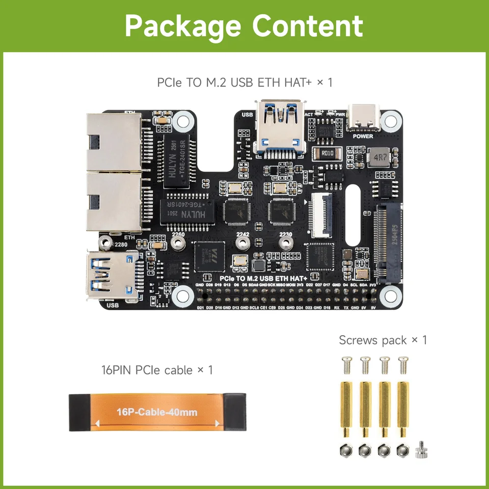 Raspberry Pi 5 Pcie Hat Waveshare PCIe To USB 3.2 Gen1 / 2.5G ETH/M.2 NVMe Adapter, Compatible With Raspberry Pi 5, Supports NVMe Protocol M.2 Solid State Drive, Expands 2-ch Accessoire Raspberry Pi 5 Stockage Réseau Dual Expansion: Adds both an M.2 NVMe SSD interface and a Gigabit Ethernet port to the Raspberry Pi, enhancing its functionality. High-Speed Connectivity Waveshare PCIe zu M.2 4G/5G und USB 3.2 HAT für Raspberry Pi 5 Compact Design: The HAT Plus maintains a small form factor while offering multiple connectivity options. HAT PCIE A M.2 USB ETH PARA RASPBERRY PI 5 – EXPANSIÓN NVME, DOBLE... Rich WiKi Resources: We provide official Wiki resources, please contact us for more information. Compatibility: Works seamlessly with Raspberry Pi 5, providing easy integration. Driver-Free Setup: No need for additional drivers; plug-and-play functionality ensures hassle-free use. Dual Expansion: Adds both an M.