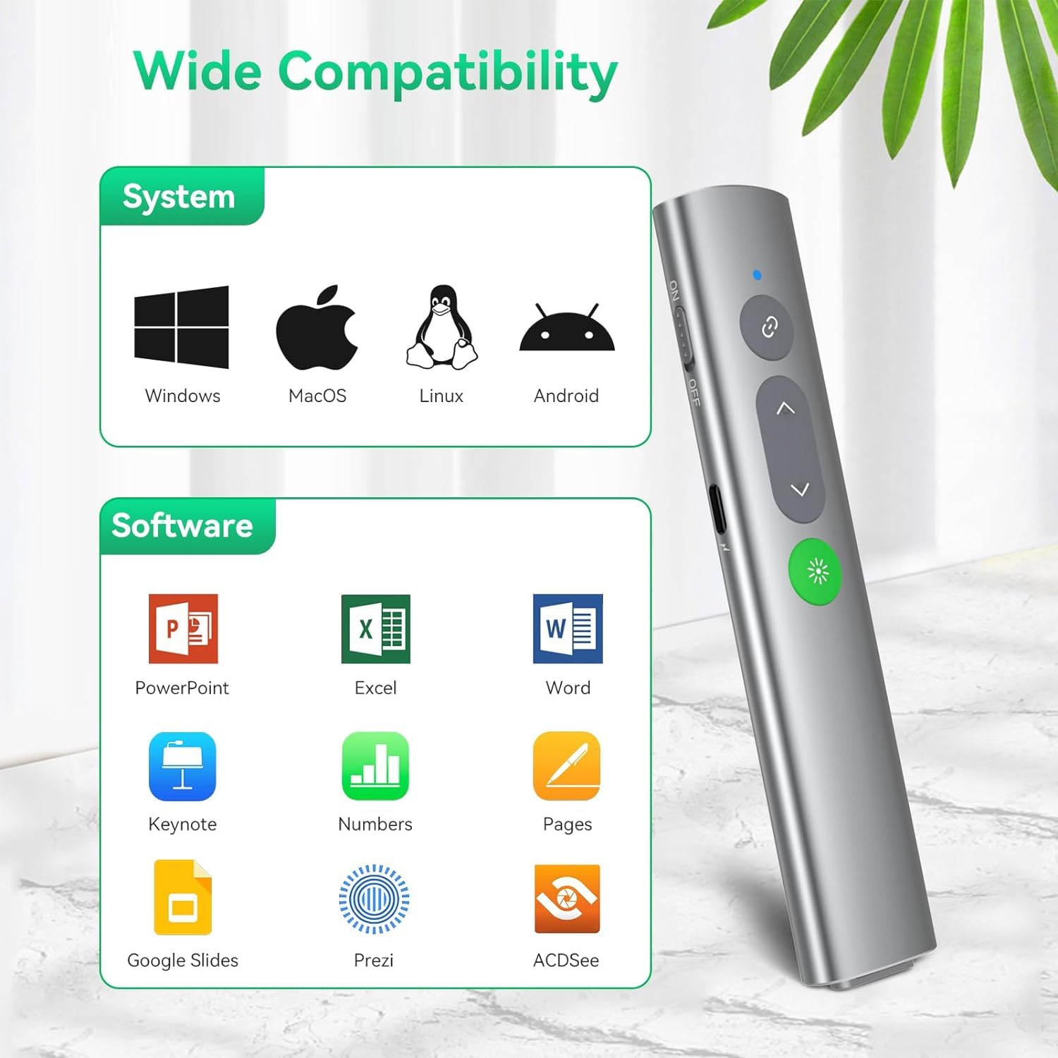 Parfait pour les conférences, les conférences ou les rendez-vous de réunion. Presenter Avec Timer Batterie Best Presentation Pointeur Présentation Sans Fil - 2Pcs Avec USB-A/C - Portée 30m - Pour PowerPoint, Enseignement Pointeur Laser Powerpoint Présentateur Sans Fil USB-C USB Le récepteur USB intégré tient bien dans l'appareil et ne tombe pas. Présentation Powerpoint 2,4 GHz Télécommande sans Fil USB Présentateur... La portée sans fil de 30 m garantit une liberté de mouvement totale. 30 jours d'autonomie + mode d'économie d'énergie intelligent : alimenté par 2 piles AAA (nos produits ne contiennent pas de piles) Ce présentoir dure jusqu'à 30 jours en veille. Presenter remote for MS Word, Excel, PowerPoint, ACD See, iWork (Keynote & Numbers & Pages) Google... Présentateur avec portée de 200 m | Précision pour chaque pièce : le pointeur de lumière rouge intégré atteint jusqu'à 200 m – Idéal pour les grandes salles de conférence ou les salles de conférence. Présentez facilement avec PowerPoint, Keynote ou Google Slides. L'écran affiche le niveau de batterie actuel (100 %, 80 %, 60 %…) pour que vous soyez toujours prêt. Generic Présentateur Sans Fil 2.4 GHz USB-C Avec Laser Et Controle Du Volume Compatible Powerpoint Keynote Google Slides Pour Mac Windows 67328463 L'interrupteur à 3 niveaux (PowerPoint/Off/Keynote) permet de basculer rapidement entre les applications. Restez ponctuel, restez souverain : avez-vous besoin de respecter un calendrier strict ? Activez la minuterie intégrée.