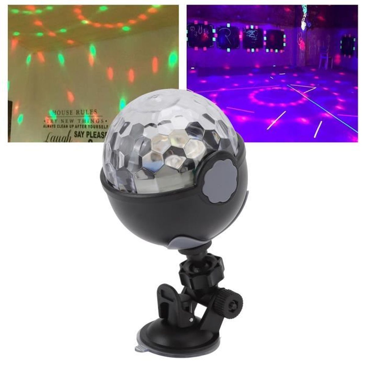 Lampe Disco Portable Atyhao Lumière De Scène RVB USB Boule Colorée Lumière 2 Modes D Lampe Ambiance Couleur Vibrant SALALIS lumière de scène LED SALALIS Lumière de scène Ampoule LED Lumière de scène LED - DIOCHE - MAG 5W - 48 LED - Couleurs RVB... Vous pouvez également utiliser des ventouses pour fixer la veilleuse au verre lisse ou à l'appartement de votre voiture., 4., et léger, il peut être transporté dans votre sac ou sac., 5., Il peut être utilisé comme décoration à la maison et aide à ajouter une atmosphère à votre intérieur. Caractéristiques : Matériau : ABS + PC., Poids : environ 35 g. Batterie : batterie au lithium. Caractéristiques : 1., Les lumières changent avec la musique et le rythme, vous apportant différentes expériences., 2., Livré avec un câble USB, rechargeable., 3., Vous pouvez le tenir sur votre main comme un bracelet. Contrôle du son : les lumières changent avec la musique et le rythme, la boule disco vous offre une expérience différente, et vous pouvez profiter d'un merveilleux festin visuel sans opérations supplémentaires., ., ., ., 【Conçu pour être rechargeable】 La lampe boule disco est équipée d'un câble de données USB, qui peut vous fournir quatre heures d'autonomie après une demi-heure de charge, et vous pouvez l'utiliser sans câble, ce qui est très pratique. 【Facile à utiliser】Disco Light est équipé d'une sangle et d'une ventouse, de sorte que vous pouvez le porter comme un bracelet, ou utiliser la ventouse pour le fixer sur du verre lisse ou un plat., ., ., ., Pratique à transporter : la boule lumineuse magique est de petite taille et légère, de sorte qu'elle est facile à transporter. Convient pour de nombreuses occasions : la lumière disco est adaptée pour la décoration de la chambre, un excellent cadeau pour l'anniversaire des enfants, un mariage, un spectacle, un festival ou Noël., ., . Lumière de scène LED Norme européenne 220V - TV Son Photo