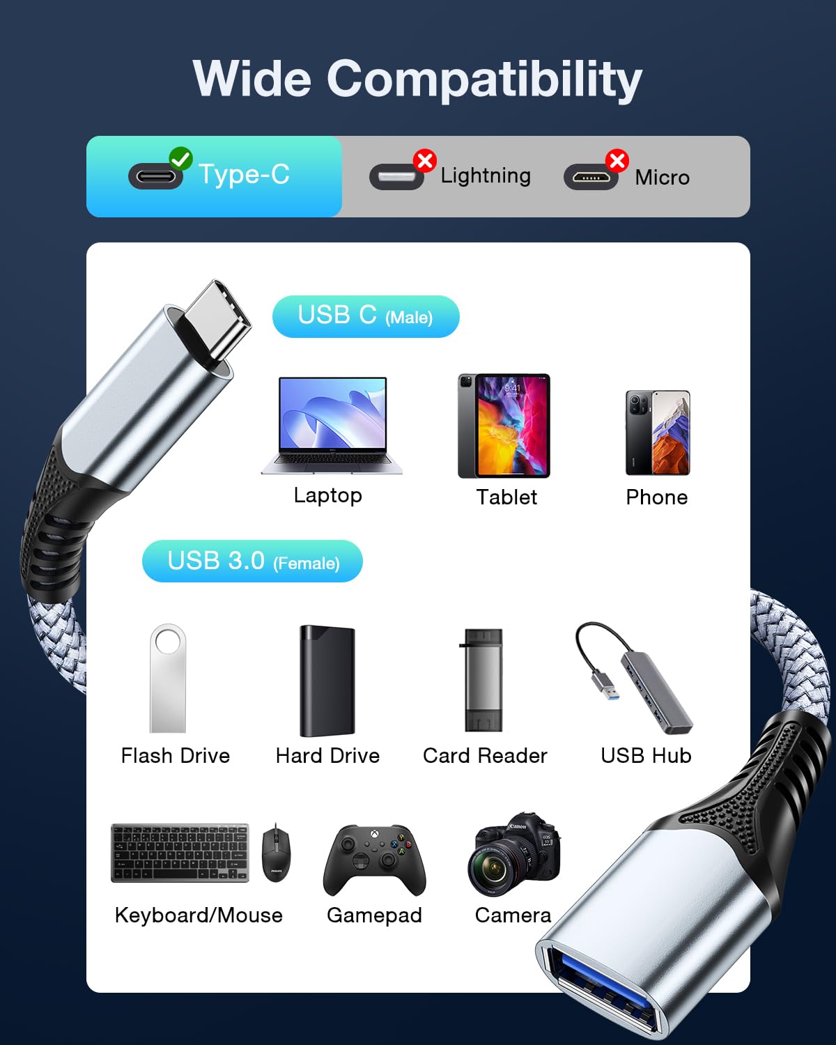 L'adaptateur USB C OTG est fin et léger, ce qui permet de le ranger facilement dans un sac de voyage et de le transporter partout. Adaptateur USB C Prise en Charge OTG: La fonction cable adaptateur OTG USB C permet de regarder des films sur un smartphone ou une tablette compatible OTG directement à partir d'une clé USB ou de modifier des fichiers sans se soucier des limitations de mémoire. Avec ses connecteurs USB 3., 0 standard, l'adaptateur USB vers USB C offre un taux de transfert de données ultra-rapide pouvant atteindre 10 Gbps. Adaptateur USB-C vers USB conçu pour s'adapter côte à côte sur les MacBook Pro 2017/2016 ou les ordinateurs portables équipés de deux ports USB-C côte à côte, cet adaptateur OTG USB C peut prendre en charge simultanément la charge et le transfert de données. Si vous rencontrez des problèmes avec OTG adaptateur USB C veuillez nous contacter. Adaptateur USB vers USB C Tressé en Nylon : cet adaptateur USB femelle vers USB C mâle a été rigoureusement testé avec de multiples branchements et débranchements afin de garantir une longue durée de vie sans rupture. Il offre également une durabilité supplémentaire pour une durée de vie plus longue. Idéal pour transférer des photos depuis un appareil photo vers un téléphone/ordinateur portable lors de vos déplacements. Grâce à l'adaptateur USB-C vers USB, vous pouvez synchroniser, charger et transférer des données depuis vos périphériques USB Ce que vous obtenez : 1x câbles adaptateurs USB C vers USB, 1x adaptateurs USB C vers USB. Branchez et utilisez des périphériques informatiques, tels que des clés USB, des claviers, des hubs, des souris et bien plus encore, pour rendre vos appareils USB-C compatibles avec les clés USB et tout autre appareil USB prenant en charge la technologie USB On-The-Go. Description du produit Adaptateur USB C vers USB 0., 12M [Lot de 2], Adaptateur USB C Câble OTG Type C Mâle vers USB A 3., 2 Femelle Compatible avec iPhone 17/Air/16 15 Pro Max Adaptateur USB C vers USB 0., 12M 2Pack, câble OTG adaptateur type C mâle vers USB femelle compatible avec les iPhone 15, 16 17, MacBook 2020, iPad Pro, Samsung Galaxy S23/S22/A53, Huawei P60/P50 et Google Pixel Adaptateur USB C vers USB Polyvalent et Puissant Adaptateur USB C vers USB 3., 2 10 Gbps Taux de transfert de données de 10 Gbps, 10 fois plus rapide que l'USB 2., 0., Réduit considérablement le temps d'attente. Pack de 2] Adaptateur USB Micro USB vers Type C avec OTG Connecteur Grâce à l'adaptateur USB-A vers USB-C, connectez vos périphériques USB A (claviers, souris, clés USB, lecteurs de cartes, manettes de jeu) à vos téléphones et tablettes USB C et autres périphériques USB C. Adaptateur USB vers USB C Raffiné et Sophistiqué La couleur et le boîtier métallique de l'adaptateur USB C vers USB sont soigneusement conçus et raffinés pour s'harmoniser avec les ordinateurs portables professionnels. Gagnez plus d'espace qu'avec des adaptateurs sans câble. Il peut également prendre en charge la charge rapide, à condition que votre chargeur et votre appareil prennent en charge l'accord de charge rapide. Adaptateur USB C OTG Compact et Portable Cet adaptateur USB femelle vers USB C mâle a été rigoureusement testé avec de multiples branchements et débranchements afin de garantir une longue durée de vie sans rupture. USB C to USB 0.12M Adapter [2PCS], USB C to USB A 3.2 OTG Adapter, OTG Type C Male to Female Cable Compatible with iPhone Air 17 16 15 Pro Max,MacBook/iPad Air... Adaptateur Type C Vers Femelle ANDTOBO Adaptateur USB C Vers USB 3.0 OTG, 2 Paquet USB C Mâle Vers USB 3.0 Femelle OTG Câble Thunderbolt3 On The Go Pour IPhone 16/15 Pro Max Plus, Samsung Galaxy S23/S22/S21/S20/S23 Câble OTG USB-C 10 Gbps Adaptateur USB vers USB C pour Transfert de Données Ultra-Rapide L'adaptateur USB vers USB C offre un transfert de données ultra-rapide pouvant atteindre 10 Gbps, soit 20 fois plus rapide que l'USB 2., 0., Transférez des fichiers en quelques secondes grâce à l'adaptateur USB C vers USB 3., 2., L'appareil connecté doit prendre en charge une vitesse de transmission de 10 Gbps. Grâce à son matériau tressé en nylon anti-enchevêtrement et à sa coque en aluminium résistante à l'usure, cet adaptateur Type C vers USB offre une meilleure dissipation thermique et est beaucoup plus fiable pour garantir un transfert de données stable et rapide. Câble USB C OTG pour Téléphone/Tablette Le câble de synchronisation réversible USB Type-C vers USB 3., 0 Type-A femelle vous permet de connecter votre clé USB, votre clavier, votre souris ou tout autre périphérique USB A standard à un périphérique compatible USB C OTG.