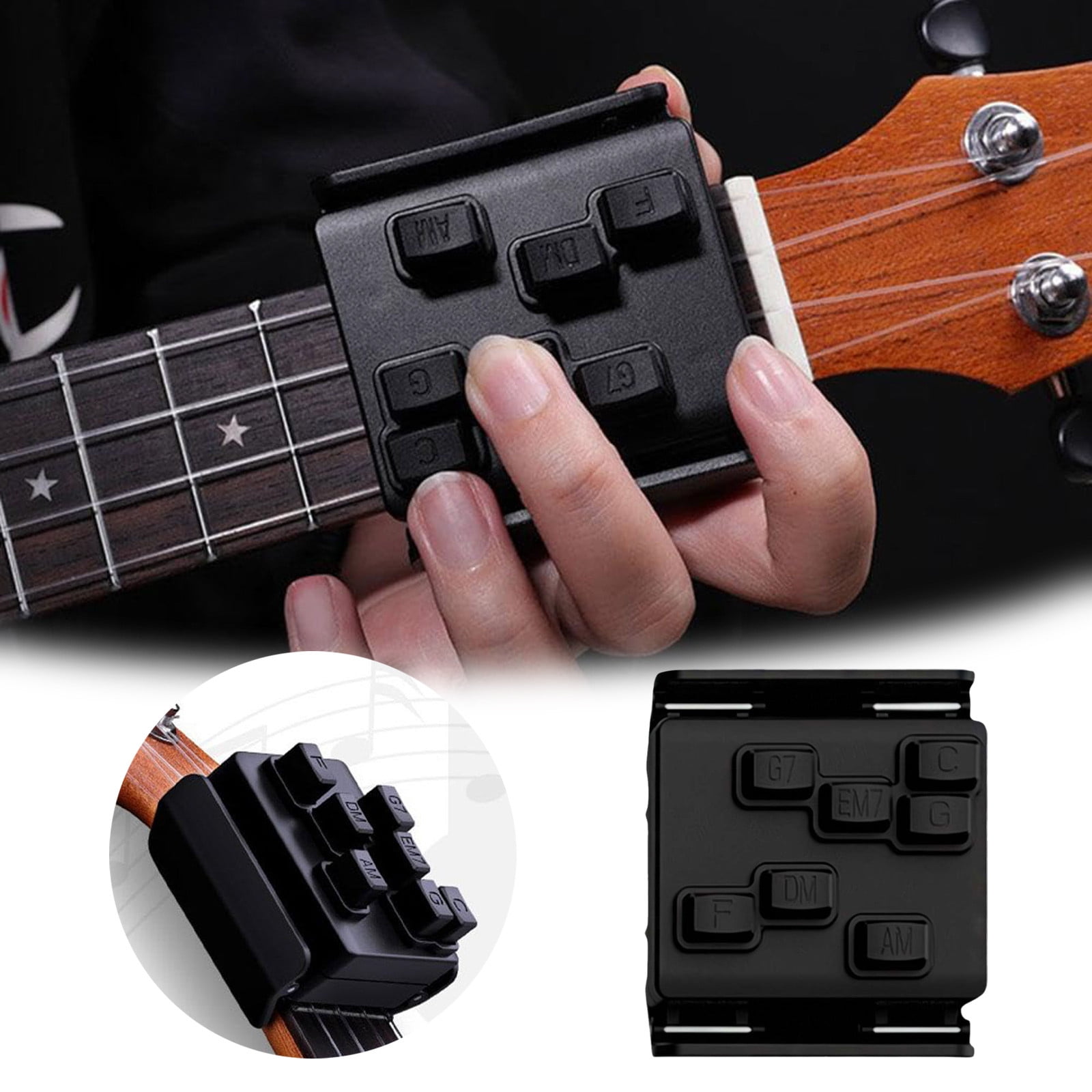 Simplifies Chord Learning for Beginners: This ukulele and guitar chord helper is designed to assist beginners in forming chords more easily and accurately, reducing finger strain and building confidence in early practice sessions Compact and Travel-Friendly Practice Tool: Small and portable, this chord trainer fits into gig bags or pockets, making it a perfect practice companion at home, school, music class, or on the go Ideal for Kids, Beginners, and Self-Learners: A great tool for young learners, beginners, or those teaching themselves at home, providing a simple path to mastering common chord patterns and songs Description du produit Presseur d'accords de guitare, entraîneur d'accords de ukulélé Accessoire Musique Portable Guitar Chord Helper, Ukulele Attachment Chord Presser, Guitar Outil Débutant Ukulélé Caractéristiques: Matériel: ABS, silicone Taille du produit: environ 8x6x6 cm/3,15x2,36x2,36 pouces Liste de colisage: 1 x presse-cordon pour guitare Remarques : 1., En raison des différents effets de moniteur et de lumière, la couleur réelle de l'article peut être légèrement différente de la couleur montrée sur les ., 2., Veuillez pardonner un léger écart de mesure dû à la mesure manuelle. Il a une structure solide tout en étant petit et léger, parfait pour la pratique en extérieur.