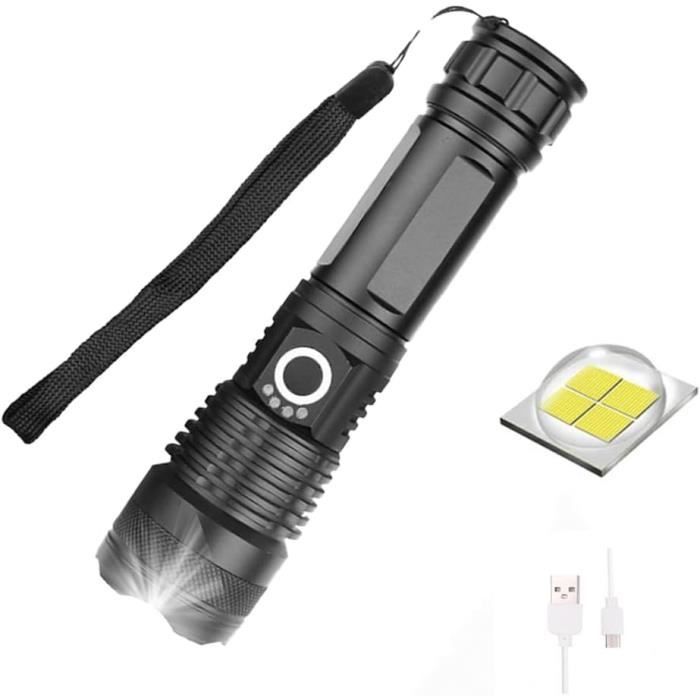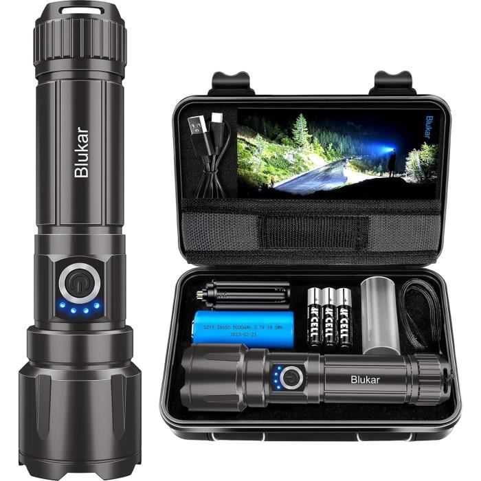 Plus besoin de piles jetables Grâce à son indice de protection IP67, elle est totalement protégée contre la poussière et peut être immergée dans 1m d'eau pendant 30 min. ✅Zoom Réglable & Utilisation Multifonction: Passez instantanément d'un spot concentré pour une longue distance à une lumière large et flood pour éclairer tout votre chemin. Une autonomie exceptionnelle pour 6-12 heures d'éclairage continu. LICHTMEISTER Linterna Profesional 2000 Lúmenes, Batería De 5000 mAh Contrôlez facilement l'intensité selon vos besoins ✅Batterie Li-ion 5000mAh & Rechargeable: Équipée d'une batterie haute capacité 5000mAh rechargeable par USB (câble inclus). Lampe Torche Puissante & Portée Incroyable: Avec une puissance de sortie de 10000 lumens et une portée de projecteur allant jusqu'à 3000 mètres... Si votre torche fonctionne mal dans des conditions normales d'utilisation, contactez-nous directement par le biais de la fonction de messagerie d'Amazon et nous vous fournirons une réparation ou un remplacement gratuit - pas de formulaires compliqués à remplir ni de frais cachés. Lampe Torche LED Ultra Puissante 1000000 Lumens Vidéo de marchand Parfaite pour la pluie, la neige ou les accidents en plein air Torche Camping Portée 3000m BEYSTE Lampe Torche LED Ultra Puissante, 1,000,000 Lumens Lampe De Lampe Rechargeable Lampe Torche Robuste et Étanche : le boîtier en aluminium est scellé et est non seulement résistant aux chutes mais aussi étanche selon les normes IP67 Compagnon parfait pour le camping, la randonnée, la pêche, le jogging avec votre chien, ou comme lampe de secours à la maison