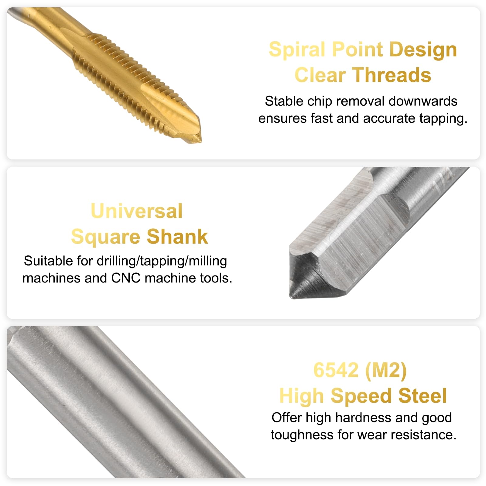 Le taraud fileté est doté d'un point spirale, d'un chanfrein de bouchon et d'un filetage à droite. Tarauds QUARKZMAN En Spirale - 1/4-28 UNF 2B - Parfait Pour L'angle de taraudage doit être de 90 degrés vertical et stable, et la profondeur de taraudage ne doit pas dépasser 1,5 fois le diamètre du taraud. Taraud Machine 1/4-28 UNF B2 QUARKZMAN 1/4-28 Unf B2 Foret De Taraudage à Pointe En Taraud Point Spirale Les tarauds filetés plaqués titane améliorent la résistance à la corrosion et à l'oxydation, prolongeant la durée de vie, ce qui est très adapté Pour une large gamme d'applications. Les tarauds à rainures droites peuvent éliminer les copeaux vers le bas, avec des filets clairs et des arêtes de coupe tranchantes, assurant un taraudage rapide et précis. VBESTLIFE Taraud fileté Taraud à vis M3 M5 M6 M8, mèches de taraudage HSS à éjection de puce... Caractéristiques: Le taraud fileté est doté d'un point spirale, d'un chanfrein de bouchon et d'un filetage à droite. Plus la dureté est élevée, plus la vitesse est lente. Taraud HSS pour trous débouchants, dans des aciers non alliés et faiblement alliés jusqu'à 800 N/mm², la fonte et les métaux non ferreux. Taraudage à la... La vitesse est contrôlée en fonction de la dureté du matériau. Les rainures sur le taraud facilitent l'élimination des copeaux et des débris du trou. Utilisez avec de l'huile de taraudage Pour améliorer la précision de l'usinage et réduire la probabilité de casse. Description:Fabriqué en acier rapide, le taraud a une dureté, une ténacité et une résistance à l'usure élevées, et peut éliminer les copeaux de manière stable pendant la coupe. Spécification:Taille De Filetage: 1/4-28 UNFLargeur Du Côté De La Tige: 5mm / 0., 2 pouceLongueur Du Filetage: 24mm / 0., 94 pouceLongueur Totale: 69mm / 2., 7 poucesPrécision: B2Matériau: HSS 6542 (Acier Rapide 6542)Finition: Revêtu De TitaneContenu De L'emballage:1pcs x Taraud À Point Spirale
