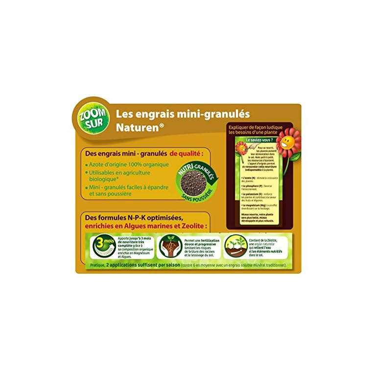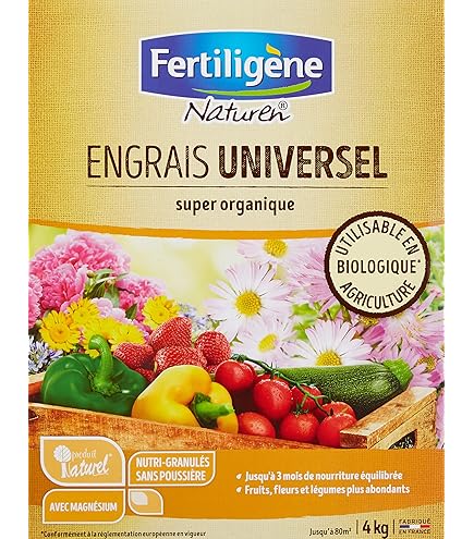VOLUME GÉNÉREUX: Contient 2,5 litres d'engrais concentré à diluer, permettant de nombreuses applications Fertiligène 2.5 L Avec Zéolite Engrais Universel - Fertiligène 700g - Jardi Pradel - Jardinerie Et Engrais Plantes Potager La formulation favorise une floraison et des récoltes plus abondantes tout en stimulant la croissance. L'engrais complet universel est idéal pour les fruits, les légumes et les fleurs. Sa formule en bouchons convient parfaitement au potager Une solution complète pour des plantes vigoureuses et productives tout au long de la saison. FORMULE UNIVERSELLE: Engrais liquide complet adapté à tous types de végétaux - plantes d'intérieur, d'extérieur, plantes vertes, légumes et fruits du potager Fertiligene Engrais Universel Complet, Solution Diluable, 2,5 L, 100% Origine Naturelle ; Amazon Logo, 21,86 €, Voir l'offre ; Amazon Marketplace Logo, 21,86... Pour des résultats optimaux, suivez les instructions de dilution indiquées et conservez le produit entre 5 et 25°C. Utilisable de mars à septembre, avec un dosage simple : une fois par semaine pour 1L d'eau. COMPOSITION NATURELLE: Enrichi en zéolite, un minéral naturel qui améliore l'absorption des nutriments par les plantes Boost your plant growth with Fertiligène fertiliser Le flacon pratique avec poignée ergonomique facilite l'application. DOSAGE PRATIQUE: S'utilise dilué de mars à septembre, une fois par semaine pour des résultats optimaux