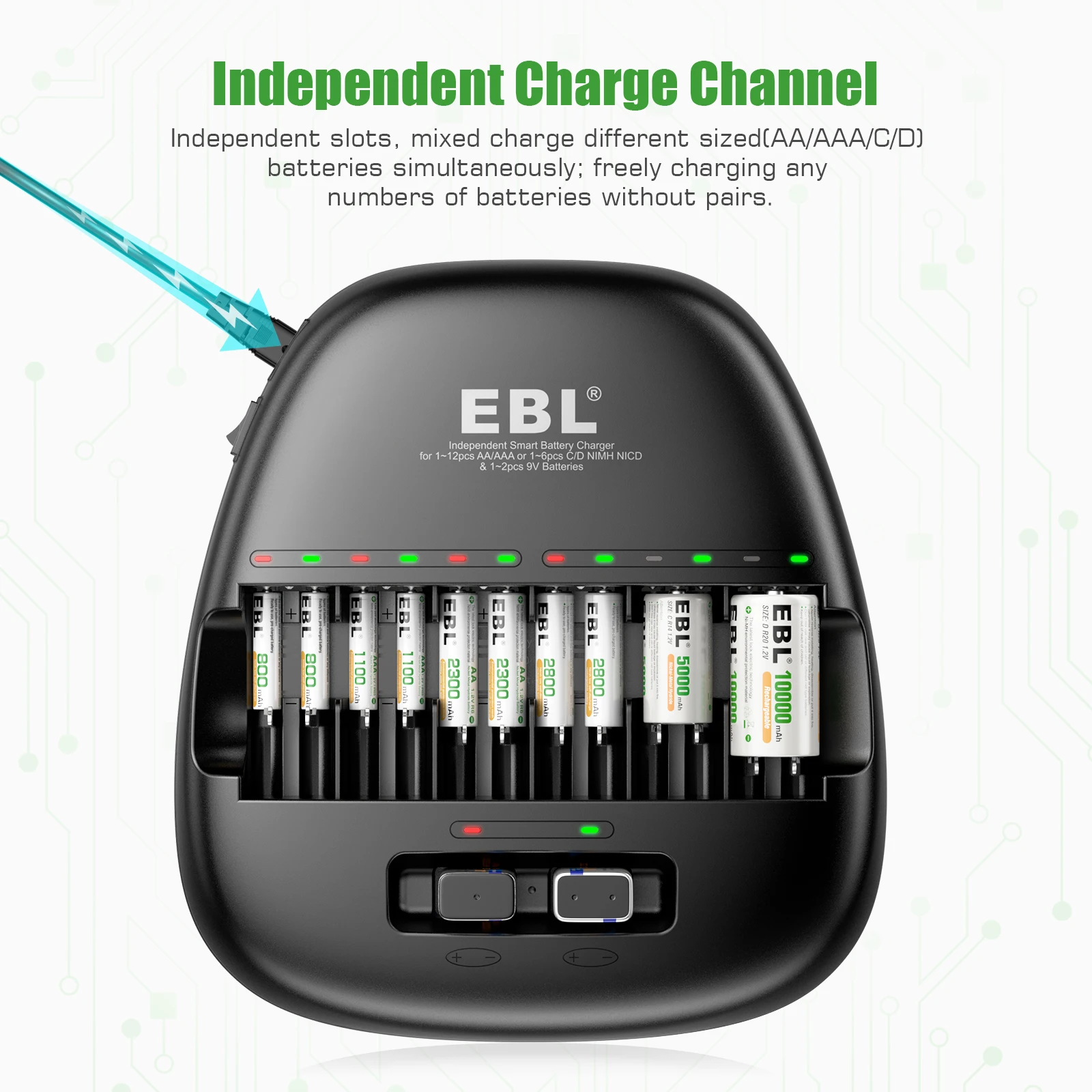 Chargeur 14 Slots Chargeur De Piles Rechargeables Chargeur Universel Piles AA AAA C D 9V - Écran LCD Et Fonction Décharge - Micro USB/Type C Chargeur Pile 9v Chargeur Batterie Professionnel Il dispose de fentes de charge indépendantes, permettant de charger simultanément jusqu'à 4 piles AA/AAA/C/D ou 2 piles 9V Ni-MH/Ni-CD. Ce chargeur est idéal... Chargeur AA AAA C D 9V Chargeur Batterie EBL 14 Baies Pour AA/AAA/C/D/9V Ni MH/Ni CD/Li ion Avec Écran LCD Chargeur Intelligent Détection L'écran LCD détecte intelligemment les piles AA mauvaises et non rechargeables et affiche des icônes clignotantes sur l'écran LCD. Peut charger les batteries individuelles, 10 baies/emplacements. Chargement facile 1/2/3...9/10 piles AA AAA L'écran LCD montre le processus de charge. Charge-L... Prévention des incendies/explosions : le corps du chargeur aaa et aa 9 V est évidé pour disperser la chaleur lors du chargement de la batterie, et le chargeur intelligent est fabriqué à partir de matériaux de haute qualité, ce qui élimine la possibilité que le chargeur prenne feu et explose. Fonction de décharge : appuyez sur le bouton pour décharger la batterie. « DISCHG » apparaît sur l'écran LCD et la batterie passe automatiquement en mode de décharge. Emplacements séparés : le chargeur de batterie domestique a des canaux de charge séparés et le chargeur LCD a une capacité de 450 mA pour charger 1 à 10 piles Ni-MH AA AAA 1,2 V et 1 à 4 piles 9 V, pas besoin de charger par paire.